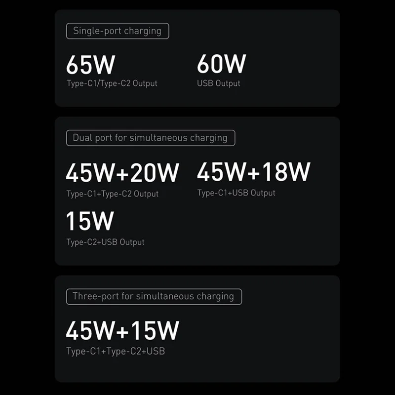تایپ سی 1 یا 2 به تنهایی: 5 ولت 3 آمپر | 9 ولت 3 آمپر | 12 ولت 3 آمپر | 15 ولت 3 آمپر | 20 ولت 3.25 آمپر=65W
