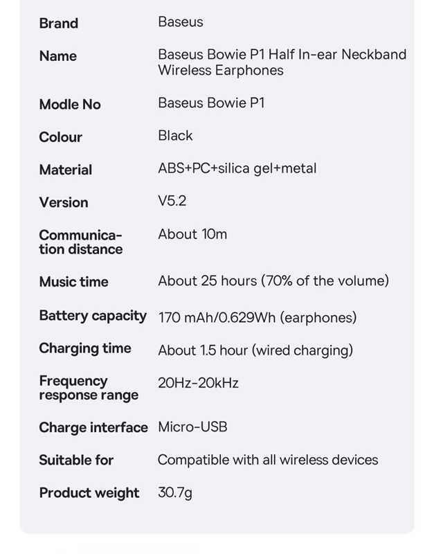 در طراحی هندزفری گردنی بیسوس P1 Bowie از سیلیکون، پلاستیک مقاوم ABS و PC و فلز استفاده شده که با پوست شما سازگار بوده و شما را اذیت نخواهد کرد. وزن این هندزفری حدود 31 گرم می باشد.