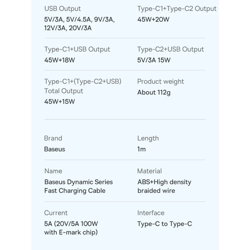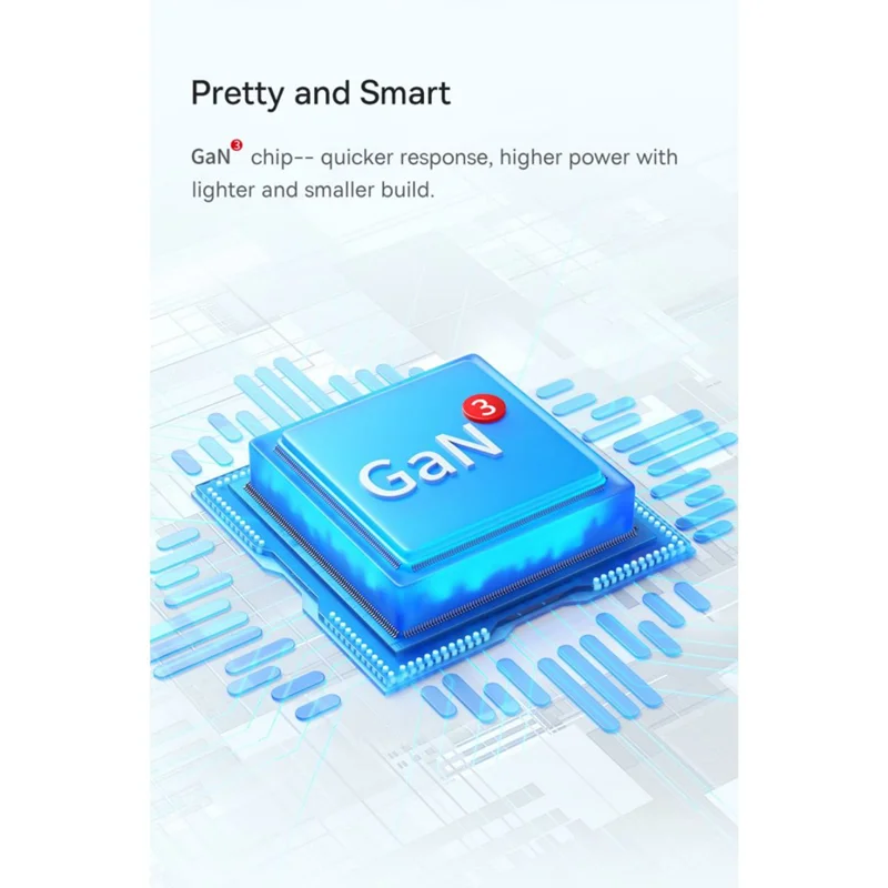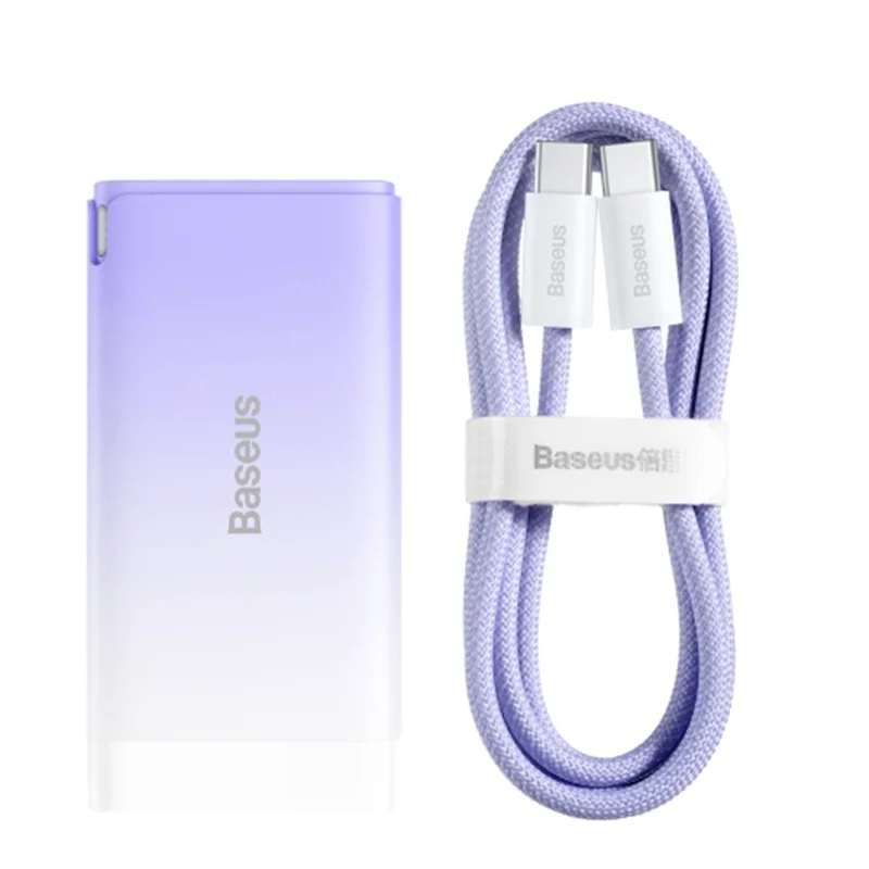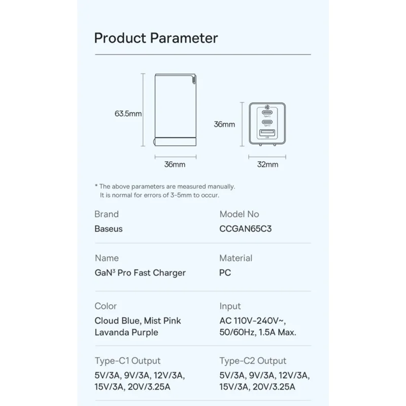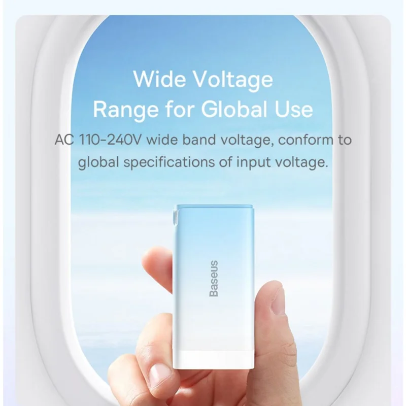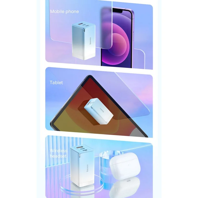 توان خروجی کلی آداپتور فست شارژ بیسوس برابر با 65W بوده و ولتاژ ورودی آن برابر با 110-240V است. تکنولوژی Baseus Power Split II یا BPS II از نوآوری های شرکت بیسوس است که اجازه میدهد تا توان بین 3 پورت تقسیم شده و هر پورت آداپتور شارژ سریع بیسوس بتواند با توان بالا دستگاهها را شارژ کنند. GaN3 Pro در واقع خلاصه شدهی Gallium Nitride یا گالیوم نیترید است که یکی از مواد نیمه رسانای جدید محسوب میشود. از جمله ویژگیهای این ماده میتوان به پهنای باند بالا، رسانایی گرمایی زیاد، مقاومت گرمایی زیاد، مقاوم تابشی، مقاومت در برابر اسید و قدرت و استحکام بالا اشاره کرد.