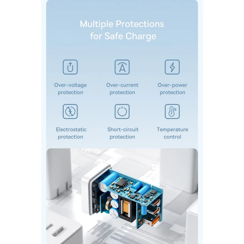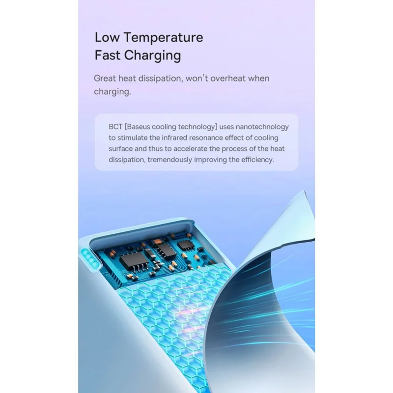 شارژر فست شارژ بیسوس با بهرهگیری از این تکنولوژی در عین اینکه ابعاد کوچکی دارد بسیار قوی عمل میکند و قادر است 3 دیوایس مختلف مثل گوشی موبایل و لپ تاپ شما را به طور همزمان شارژ کند. بیسوس برای راحت کردن خیال کاربران از استفاده این شارژر برای شارژ کردن وسایل اکترونیکی خود چندین سطح محافظتی بر روی این دستگاه قرار داده است. این سطوح شامل محافظت در برابر ولتاژ بیش از حد، شدت جریان بیش از حد، قدرت بیش از حد و اتصال کوتاه میشوند. همچنین برای جلوگیری از داغ شدن بدنه یک سیستم دفع حرارتی در داخل برد کار گذاشته شده که از آسیب دیدن کیس شارژر جلوگیری میکند. بیسوس این تکنولوژی را به نام BCT یا Baseus Cooling Technology (سیستم خنک کننده بیسوس) یاد می کند.