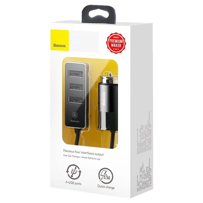 این محصول از دو قسمت شارژر فندکی و هاب تشکیل می شود که قسمت شارژر فندکی یک پورت و هاب دارای سه پورت USB می باشد.شارژر فندکی برای افراد جلو و هاب برای افراد عقب اتومبیل مورد استفاده قرار می گیرد و این دو از طریق یک کابل به طول 150 سانتی متری به هم متصل شده اند.شدت جریان خروجی کلی این محصول 5V-5.5A بوده و به شما این امکان را می دهد تا به راحتی بتوانید 4 گوشی را به طور همزمان شارژ کنید.شما می توانید از طریق این محصول هر گوشی را به طور جداگانه با شدت جریان و ولتاژ 5V-2.4A شارژ کنید سرعت شارژ بالایی محصوب می شود.