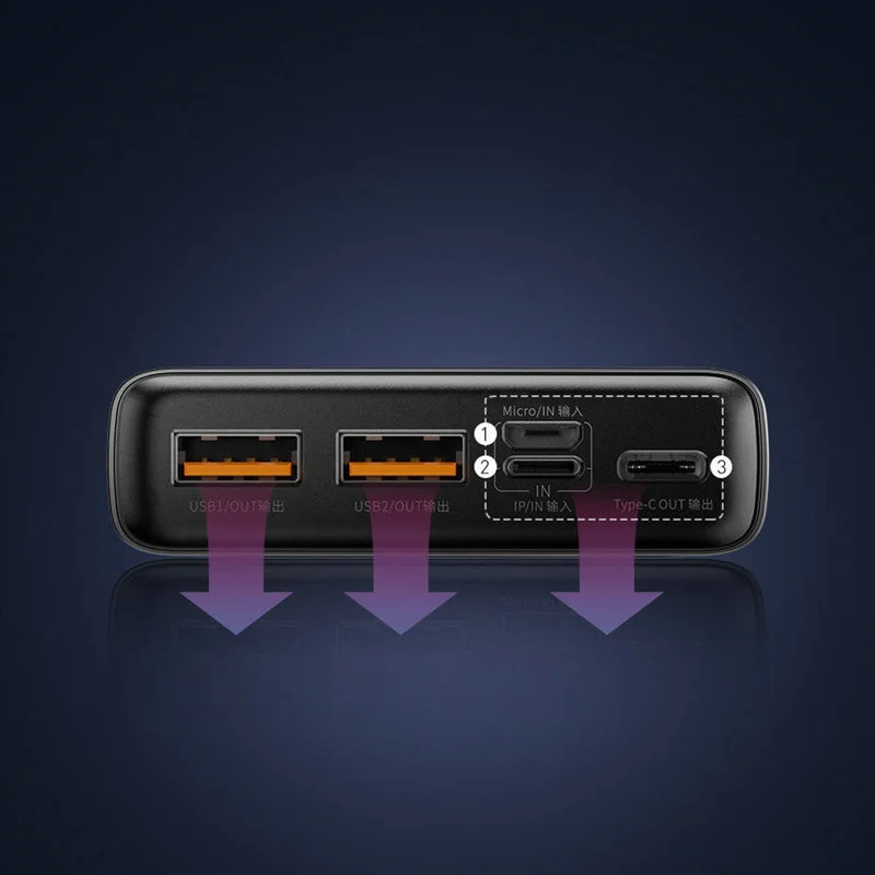 این محصول دارای سه پورت خروجی است که دوتای آن USB بوده که به شما این امکان را می دهد تا بتوانید دو گوشی را با شدت جریان و ولتاژ 5V-3A شارژ کنید. همچنین این پاوربانک دارای یک پورت تایپ سی است که هم بعنوان یک ورودی و هم خروجی استفاده می شود. این محصول دارای سه پورت ورودی بوده که شامل پورت های میکرو یو اس بی ، لایتنینگ و تایپ سی می باشد و باعث شده تا بتوانید به راحتی با تمامی این کابل ها این پاوربانک را شارژ کنید.