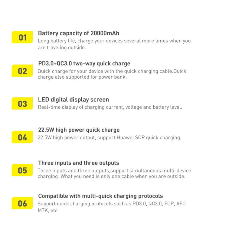 پاوربانک Baseus Adaman Metal مجهز به یک چیپست هوشمند می باشد که قادر است از باتری گوشی شما در برابر نوسانات و اتصالات کوتاه محافظت کند به گونه ای که شدت جریان خروجی از پاوربانک را با شدت جریان ورودی گوشی شما یکسان می کند تا هیچ گونه آسیبی به باتری گوشی شما وارد نشود.یکی از پورت های این محصول مجهز به فناوری QC 3.0 بوده که از گوشی شما هم دارای این فناوری باشد می توانید با سرعت بسیار بالا گوشی موبایل خود را شارژ کنید.این محصول مجهز به فناوری PD بوده که به شما امکان شارژ مک بوک را هم می دهد که در کمتر لپ تاپی دیده می شود.