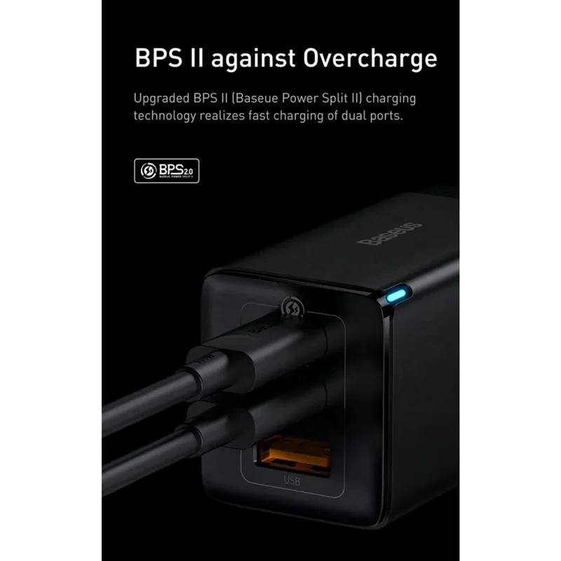 فناوری بهبود یافته GaN5 سرعت شارژ دستگاه های شما را تا 16.67 درصد افزایش می دهد! محصول Baseus از پروتکل های شارژ سریع PD3.0، QC3.0، SCP، AFC و PPS پشتیبانی می کند. با شارژر اصلی Baseus GaN5 Pro، باتری دستگاه اپل خود را 14 تا 50 درصد در 30 دقیقه شارژ خواهید کرد. همین مدت زمان کافی است تا سطح شارژ باتری اپل بوک ایر به 39 درصد برسد. این شارژر همچنین از فناوری شارژ سریع سامسونگ (45 وات) پشتیبانی می کند. شما می توانید به طور همزمان 3 دستگاه را شارژ کنید و فناوری BPS II وظیفه توزیع هوشمند برق بین دستگاه های شارژ شده و ایمنی آنها را بر عهده دارد.
