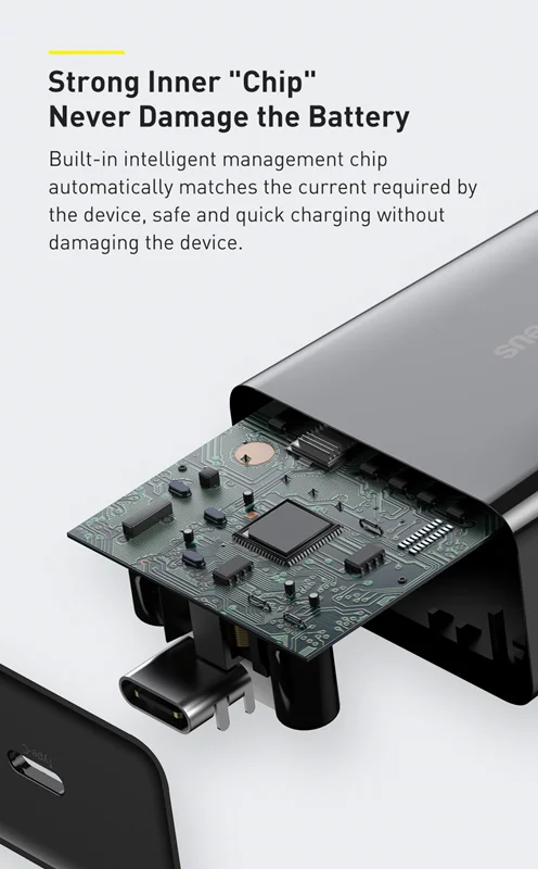 شارژر دیواری بیسوس دارای یک تراشه هوشمند بوده که وظیفه تنظیم خودکار شدت جریان و ولتاژ را بر اساس نیاز دستگاه متصل بر عهده دارد. بنابراین لازم نیست نگران آسیب دیدن باتری دستگاه الکترونیکی خود باشید. این شارژر دیواری همچنین دارای لایههای محافظتی متعددی شامل محافظت در برابر ولتاژ بیش از حد، شدت جریان بیش از حد، گرمای بیش از حد، اتصال کوتاه و موارد دیگر بوده. مزیت دیگر این شارژر بهره بردن از لایه محافظ رویی نسوز است.