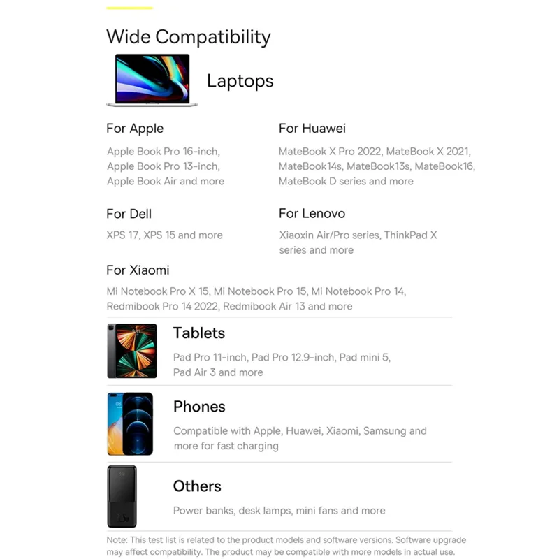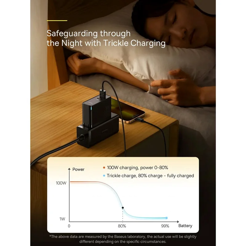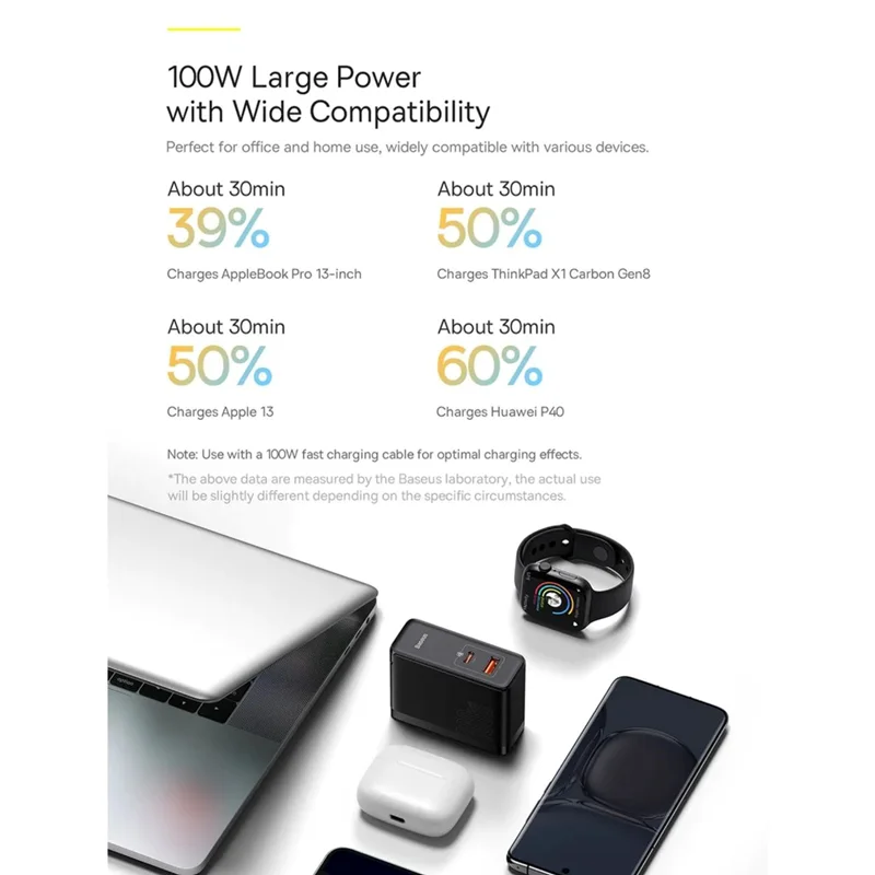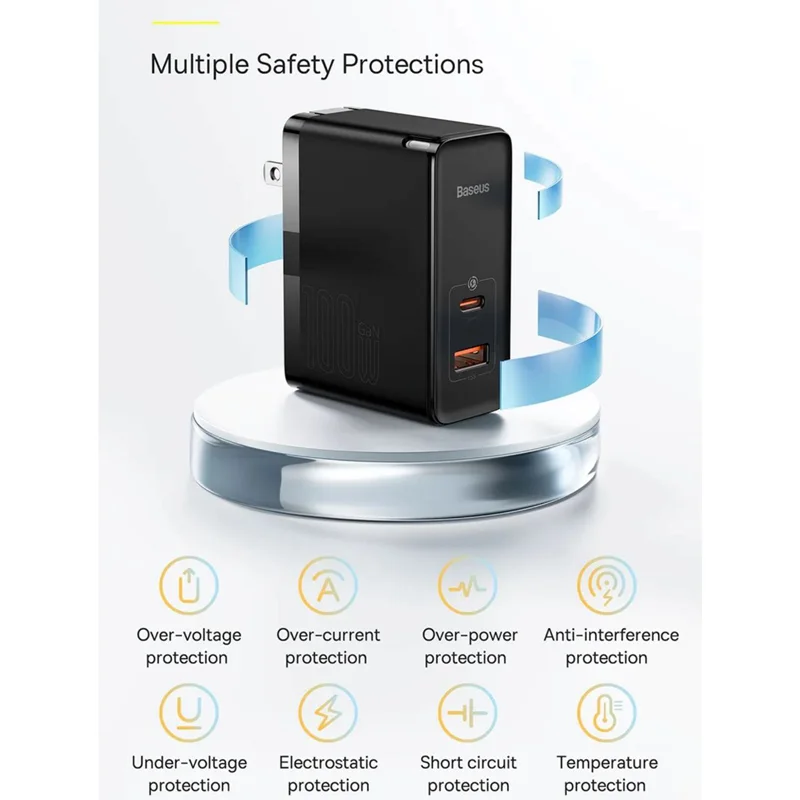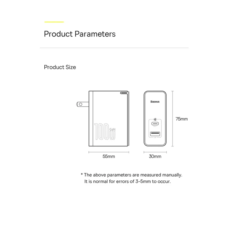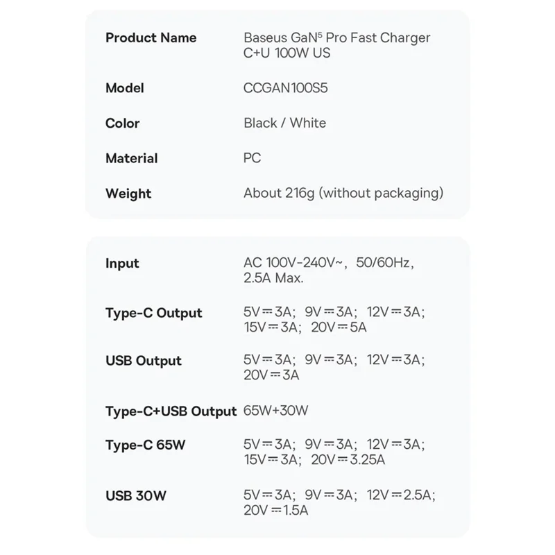 توان خروجی کلی آداپتور فست شارژ بیسوس برابر با 100W بوده و ولتاژ ورودی آن برابر با 100-240V است.