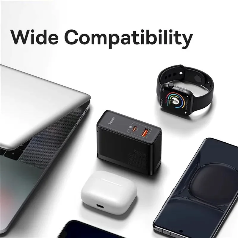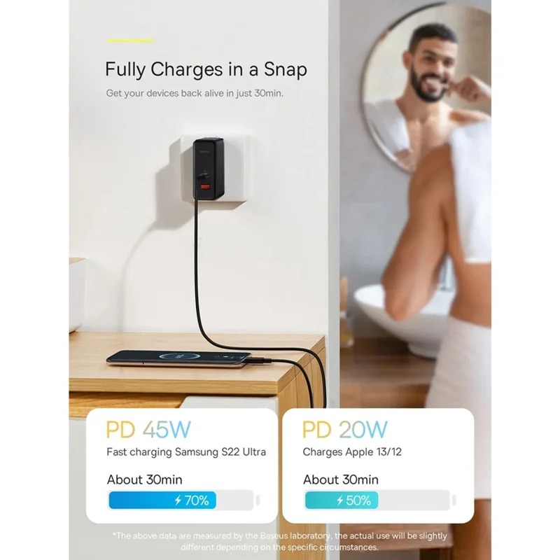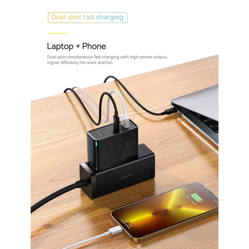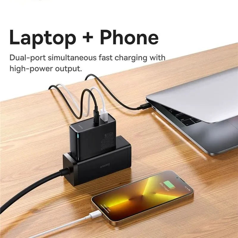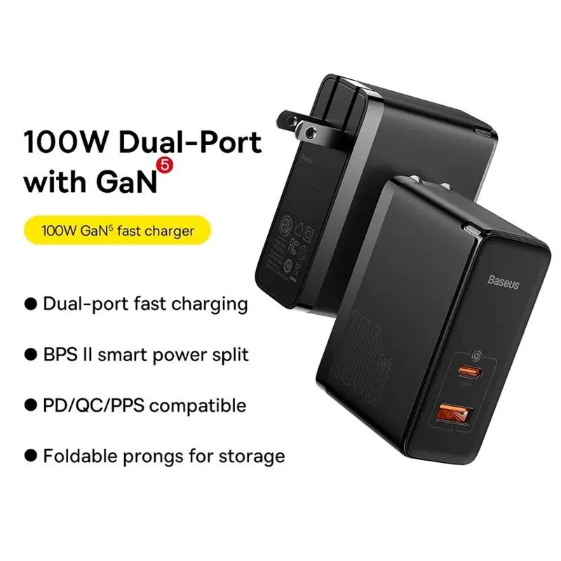 بدنه این شارژر ابعادی برابر با 30×55×75 میلیمتر دارد و حدودا 216 گرم است.جنس کلگی شارژر بیسوس GaN5 Pro از متریال PC میباشد و دوام مناسبی دارد.روی این شارژر 2 پورت میبینیم که یکی از آنها Type-C و دیگری USB هستد. تمام این پورتها از تکنولوژی فست شارژ پشتیبانی میکنند که در ادامه به بررسی آن میپردازیم.فناوری ارتقا یافته GaN5 یکپارچگی تراشه و تبدیل انرژی بالاتر را ارائه می دهد، سریعتر پاسخ می دهد و شارژر را با قدرت بالاتر کوچکتر می کند.