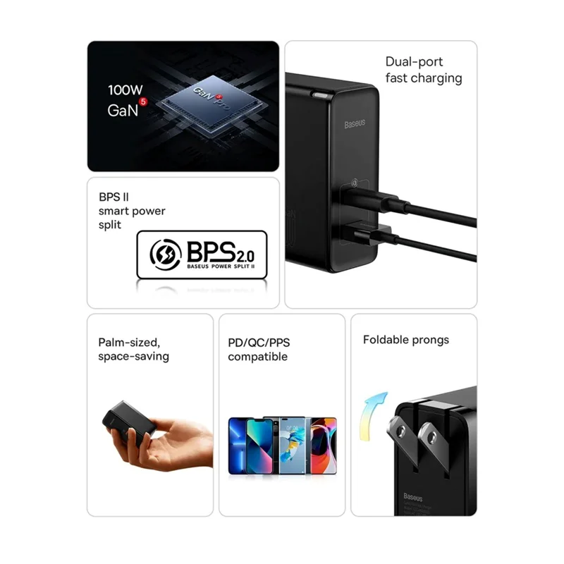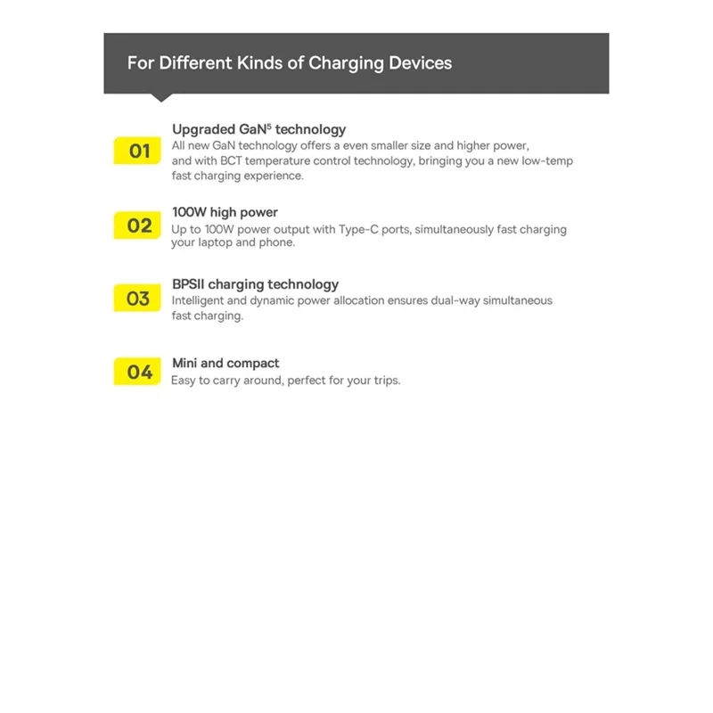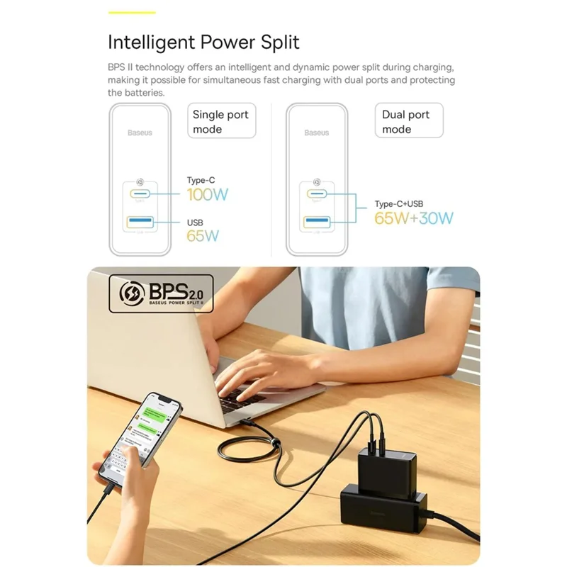 تکنولوژی Baseus Power Split II یا BPS II از نوآوری های شرکت بیسوس است که اجازه میدهد تا توان بین 2 پورت تقسیم شده و هر پورت آداپتور شارژ سریع بیسوس CCGAN2P-K01 بتواند با توان بالا دستگاهها را شارژ کنند.