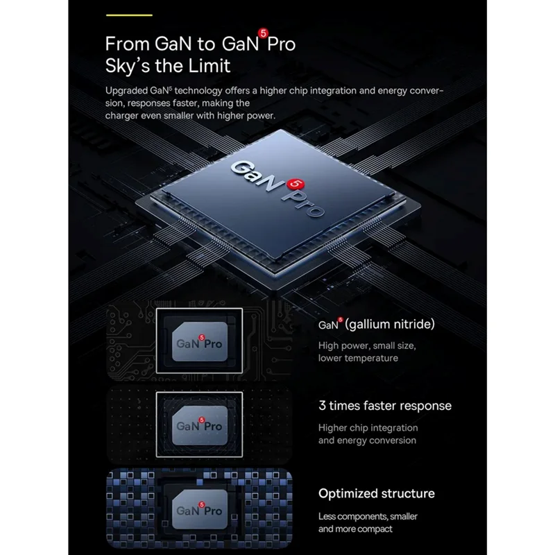 GaN5 Pro در واقع خلاصه شدهی Gallium Nitride یا گالیوم نیترید است که یکی از مواد نیمه رسانای جدید محسوب میشود. از جمله ویژگیهای این ماده میتوان به پهنای باند بالا، رسانایی گرمایی زیاد، مقاومت گرمایی زیاد، مقاوم تابشی، مقاومت در برابر اسید و قدرت و استحکام بالا اشاره کرد.