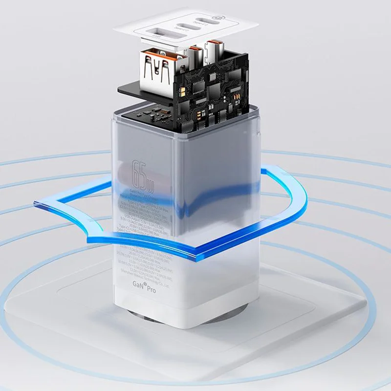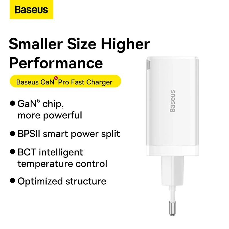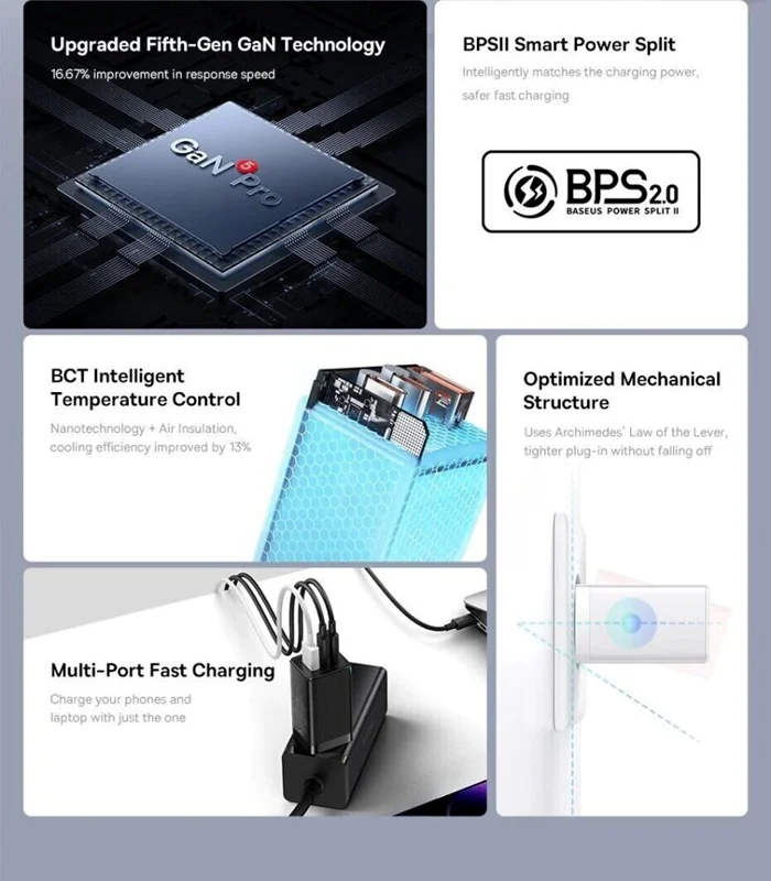 فناوری بهبود یافته GaN5 سرعت شارژ دستگاه های شما را تا 16.67 درصد افزایش می دهد! محصول Baseus از پروتکل های شارژ سریع PD3.0، QC3.0، SCP، AFC و PPS پشتیبانی می کند. با شارژر اصلی Baseus GaN5 Pro، باتری دستگاه اپل خود را 14 تا 50 درصد در 30 دقیقه شارژ خواهید کرد. همین مدت زمان کافی است تا سطح شارژ باتری اپل بوک ایر به 39 درصد برسد. این شارژر همچنین از فناوری شارژ سریع سامسونگ (45 وات) پشتیبانی می کند. شما می توانید به طور همزمان 3 دستگاه را شارژ کنید و فناوری BPS II وظیفه توزیع هوشمند برق بین دستگاه های شارژ شده و ایمنی آنها را بر عهده دارد.