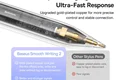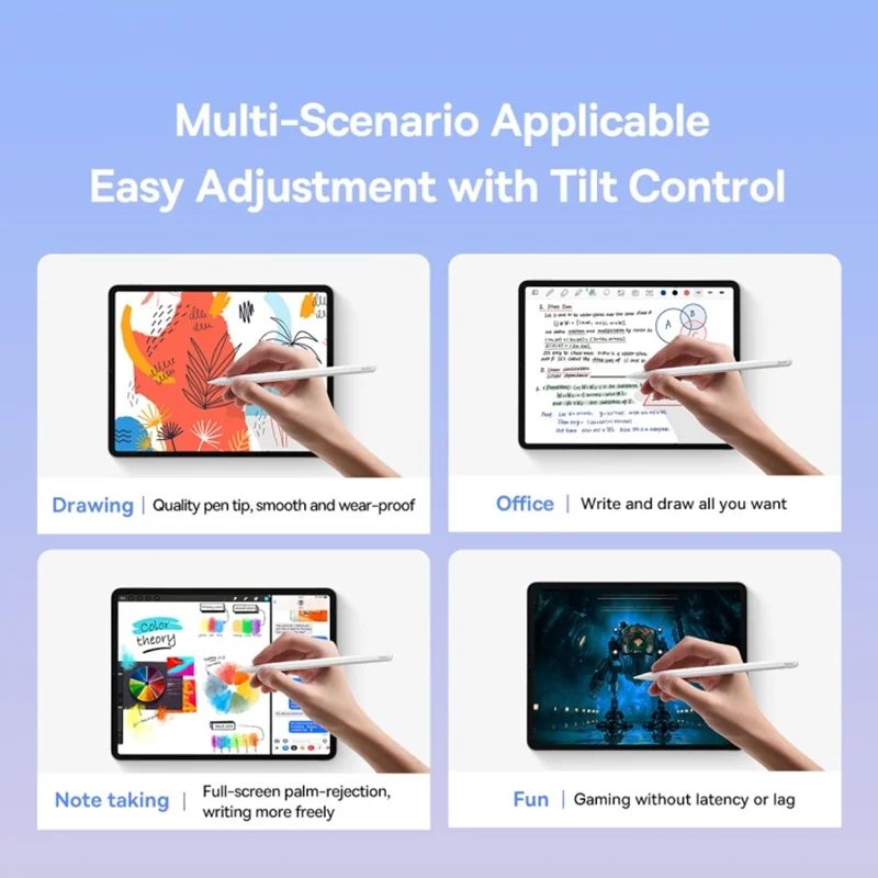 قلم Stylus به دلیل دقت بالا و سیگنال فوقالعاده قوی - به لطف نوک روکش طلا، متمایز است. در نتیجه می توانید از بازتولید کامل حرکات خود در هر زاویه ای لذت ببرید. علاوه بر این، تبلت به طور خودکار عملکرد قلم را تشخیص می دهد. سپس دیگر به لمس دست شما پاسخ نمی دهد، بنابراین می توانید آزادانه نقاشی بکشید و بنویسید بدون اینکه نگران روشن یا خاموش شدن تصادفی چیزی باشید. Baseus Smooth Writing 2 به برنامه Baseus متصل می شود. روشنایی، صدا را تنظیم کنید، عکس یا اسکرین شات بگیرید و تنها با یک کلیک به صفحه بعدی بروید. اگر قلم را در زاویه مناسب با تبلت قرار دهید، می توانید به راحتی ضخامت خطوط را تنظیم کنید.