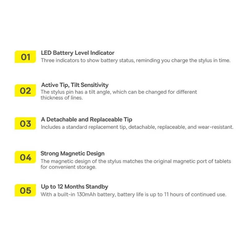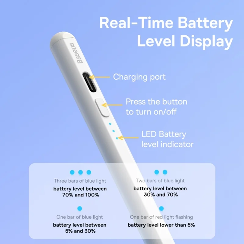 قلم بیسوس جایگزین مناسبی برای مداد اپل اصلی است. طراحی آن امکان شارژ با استفاده از یک پورت مغناطیسی اختصاصی را فراهم می کند. به سادگی آن را روی نقطه مناسب در iPad فشار دهید تا به راحتی و راحت قلم را دوباره پر کنید. یک بار شارژ تا 10 ساعت استفاده یا 12 ماه زمان آماده به کار را تضمین می کند. یک پیام در تبلت اطلاعاتی در مورد وضعیت شارژ قلم به شما ارائه می دهد.