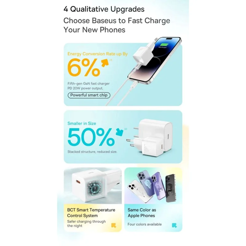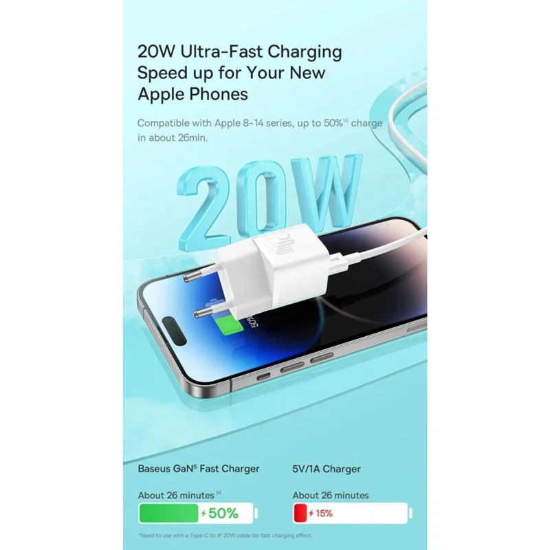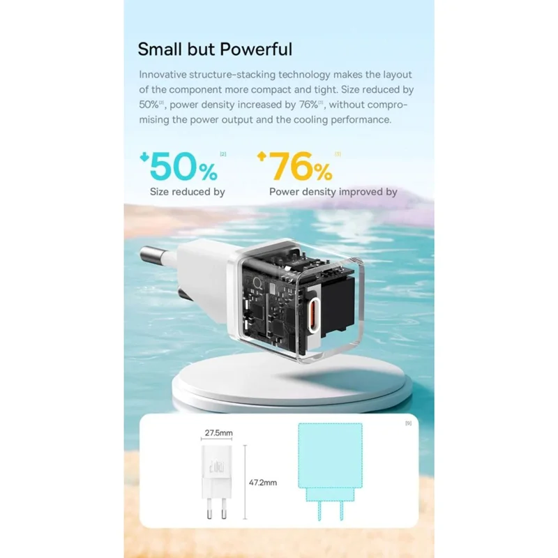 شارژر اصلی Baseus مینی مجهز به فناوری GaN است که استفاده از آن را راحت می کند. اگرچه اندازه جمع و جور آن ممکن است شما را شگفت زده کند، فریب نخورید. این شارژر با وجود اندازه کوچکش، قدرت واقعی را پنهان می کند. با 20 وات قادر است گوشی شما را تنها در 26 دقیقه تا 50 درصد شارژ کند. برای کسانی که از کارایی و عملی بودن قدردانی می کنند عالی است. این شارژر گواه این است که قدرت فوق العاده می تواند در یک بسته کوچک جا شود.