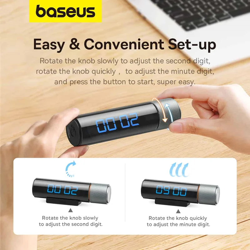 دستگاه Baseus کنترل بصری و آسانی را ارائه می دهد که راحتی استفاده را به میزان قابل توجهی افزایش می دهد. به لطف صفحه چرخشی، تنظیم زمان بسیار آسان است: برای تنظیم ثانیه ها، دکمه را به آرامی بچرخانید و دقیقه را سریع تغییر دهید. سپس به سادگی دکمه را فشار دهید تا شمارش معکوس شروع شود. عملکرد حافظه نیز مزیت دیگری است: دوبار فشار دادن دکمه به آخرین زمان تنظیم شده باز می گردد و نیازی به برنامه ریزی مجدد آن را از بین می برد. علاوه بر این، عملکرد شروع/توقف به شما اجازه می دهد تا شمارش معکوس را در هر زمان متوقف کنید. کل این ویژگی با صفحه نمایش LED با خوانایی آسان تکمیل می شود و این تایمر را بسیار کاربردی و برای استفاده آسان می کند.