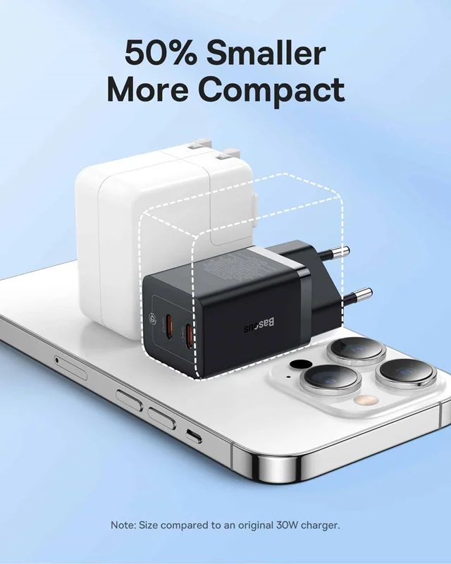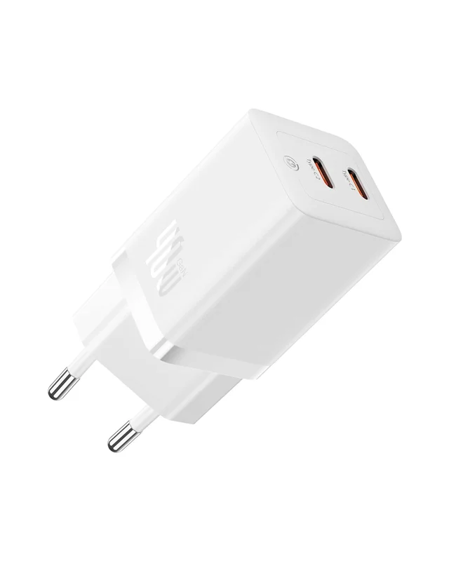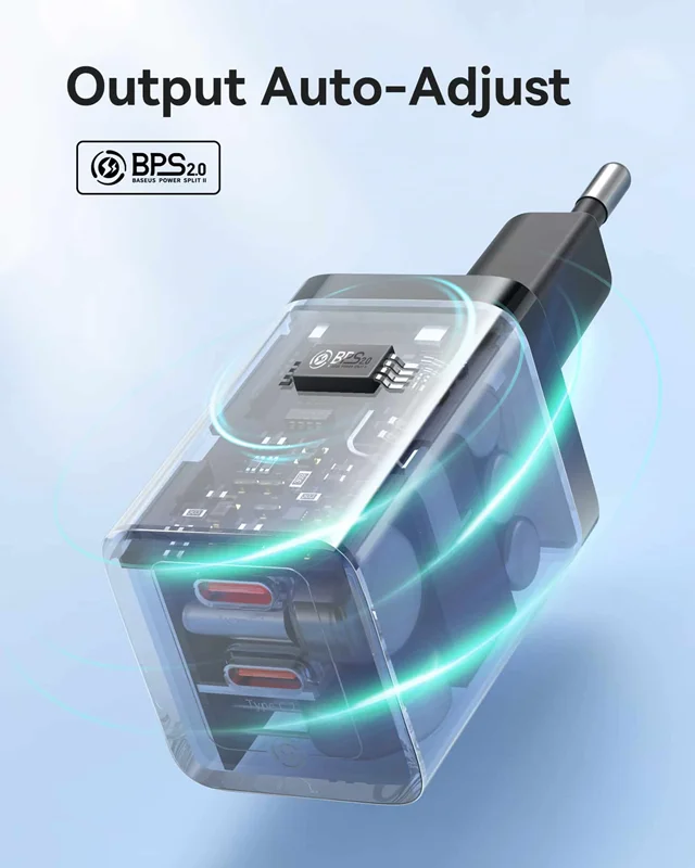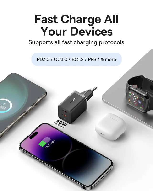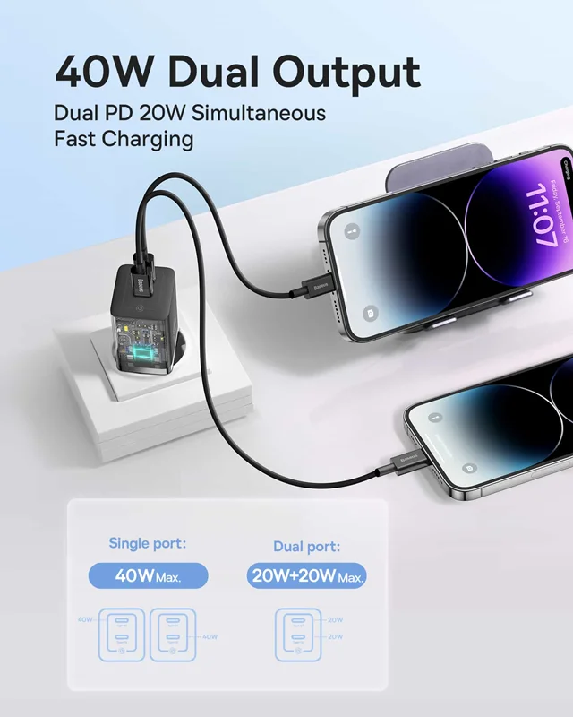 دیگر لازم نیست خیلی منتظر بمانید تا تجهیزات شما برای استفاده آماده شود. شارژر اصلی Baseus برای بازده شارژ بیشتر، آمپر را به دستگاه متصل تنظیم می کند. علاوه بر این، 2 پورت USB-C با مجموع توان 40 وات ارائه می دهد، بنابراین می توانید همزمان 2 دستگاه را شارژ کنید. در نتیجه مک بوک ایر شما در 60 دقیقه به 70 درصد و آیفون 14 پرو در حدود 30 دقیقه به 56 درصد می رسد.