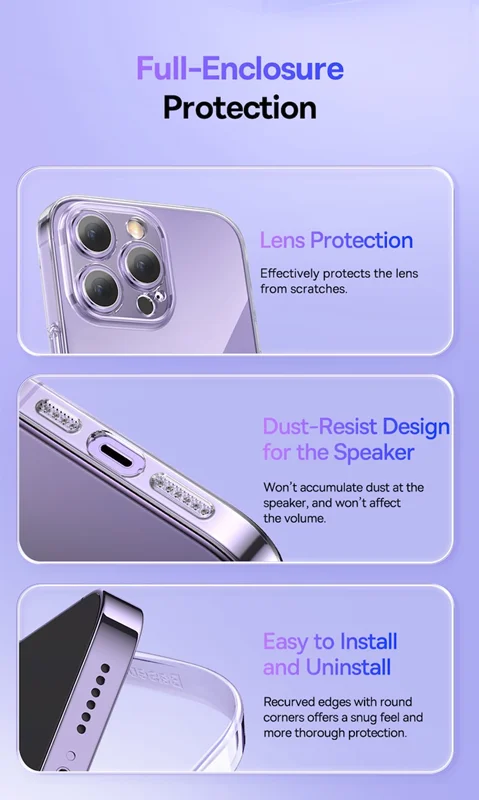 کیس برند Baseus با روکش گالوانیزه متمایز می شود که آن را در برابر زردی و اثر انگشت مقاوم می کند. در نتیجه گوشی شما همیشه تمیز به نظر می رسد. علاوه بر این، ضخامت محصول کمتر از 1.33 میلی متر است - شما حتی حضور آن را احساس نخواهید کرد! این مجموعه دارای لوازم جانبی است که به شما کمک می کند تا گوشی خود را تمیز نگه دارید.