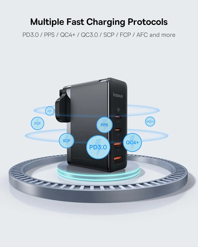 شارژر فست شارژ بیسوس با بهره گیری از این تکنولوژی در عین اینکه ابعاد کوچکی دارد بسیار قوی عمل میکند و قادر است 4 دیوایس مختلف مثل گوشی موبایل و لپ تاپ شما را به طور همزمان شارژ کند.