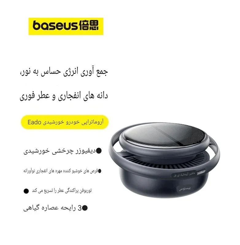 بوی نامطبوع در فضای بسته اتاقک خودرو هر شخصی را مورد آزار و اذیت قرار می دهد. یکی از محصولات خاص و منحصر به فرد کمپانی Baseus محصولی با مدل BS-CX008 می باشد هوای داخل کابین خوردو را تازه و معطر خواهد کرد. این محصول یک خوشبو کننده هوا بوده که با استفاده از انرژی خورشیدی کار می کند و بر روی داشبورد و یا هر محل صاف دیگری قابل نصب است و میتواند به کمک کیت رایحههای عطری که داخلش وجود دارد بوی مطبوعی را در فضا پخش کند.