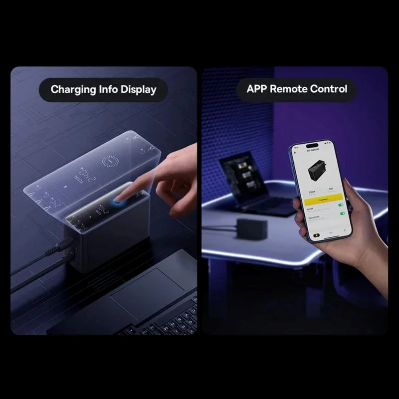 برای کنترل راحتتر شارژر 5 پورت بیسوس CCGAN240CE دو امکان بر روی این هاب شارژ قرار داده شده است: یکی صفحه کنترل لمسی و دیگری اپیکیشن. صفحه LED قرار گرفته بر روی این هاب شارژر تنها با یک بار شارژ روشن شده و اطلاعاتی در قبیل توان شارژ را در اختیار شما میگذارد. همچنین شما میتوانید با یک اپیکیشن نیز به این هاب شارژ وصل شوید. در این حالت شما میتوانید بسته به نیاز خود تا فاصله 10 متری از هاب شارژر هر کدام از درگاهها را که میخواهید کنترل کرده و خاموش و روشن کنید. همچنین میتوانید مواردی مثل دما را نیز روی این اپ چک کنید. کاربردیترین قابلیت اما این است که شما میتوانید به کمک این اپیکیشن تایمر نیز برای هر کدام از این درگاهها تنظیم کنید.