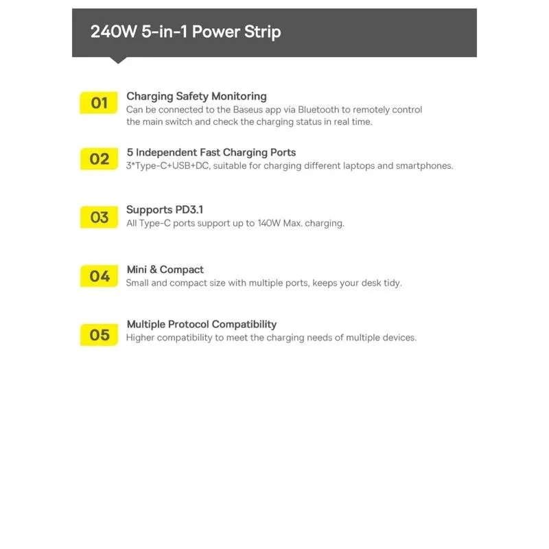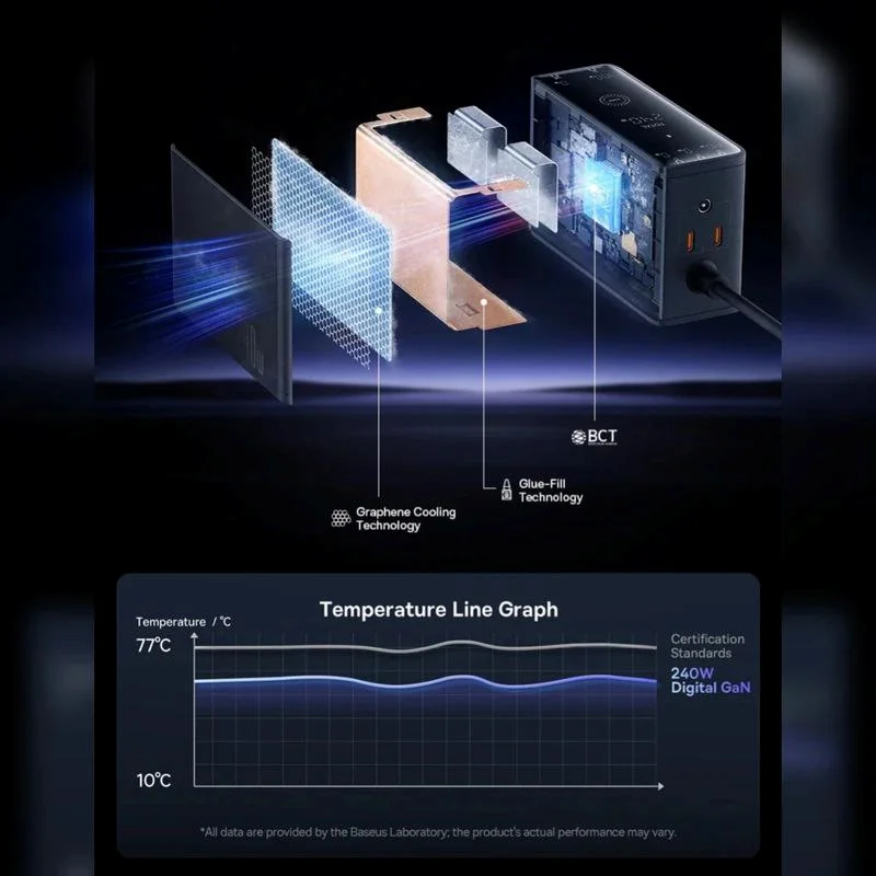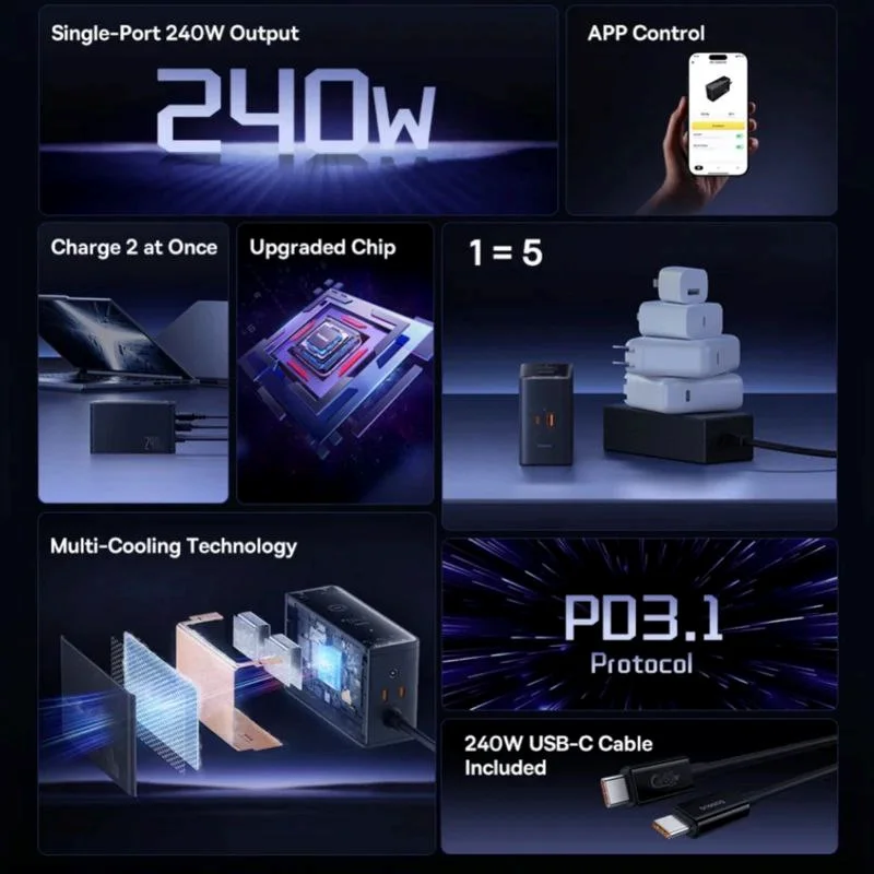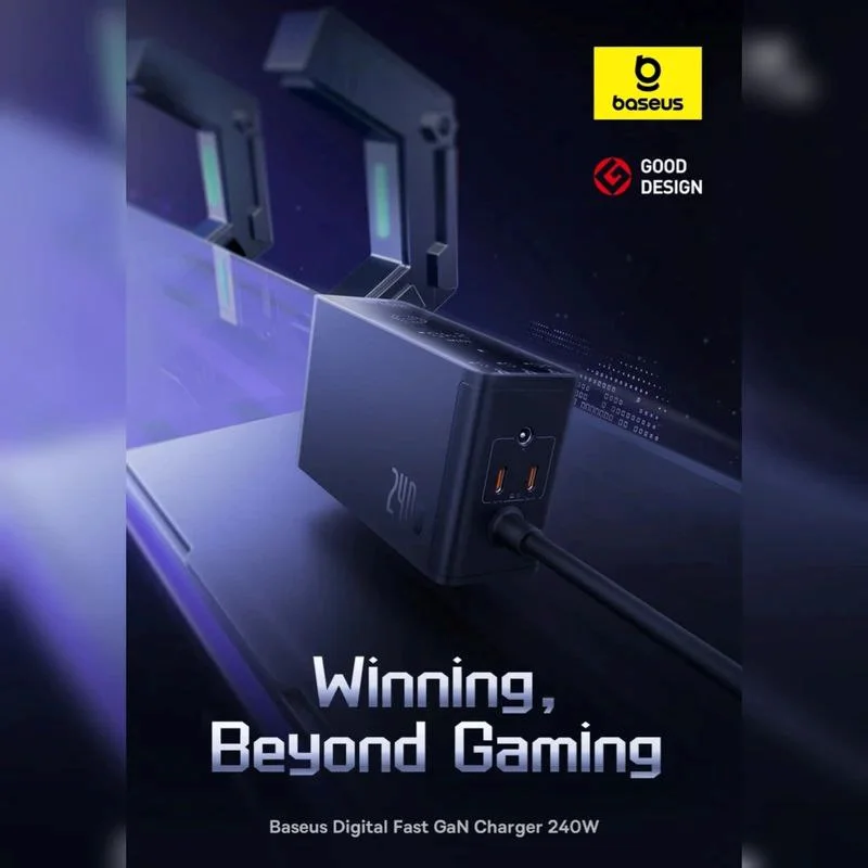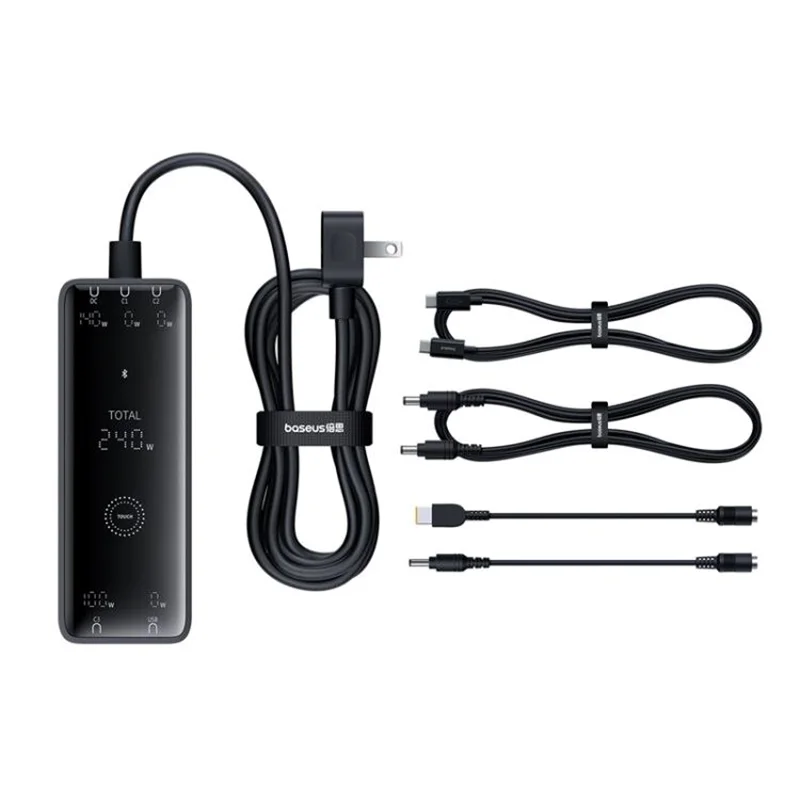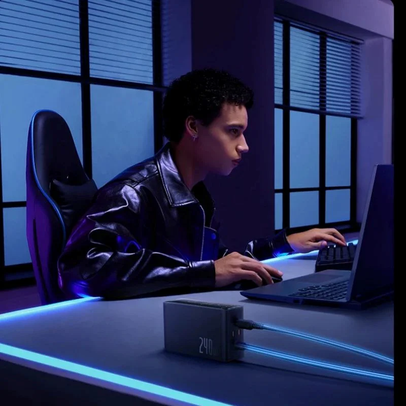 شارژر Baseus CCGAN240CE با حداکثر توان خروجی 240 وات و داشتن 5 پورت خروجی متشکل از 3 درگاه Type-c، یک درگاه USB و یک درگاه DC میتواند انتخاب خوبی برای میز کارتان باشد. به کمک این تعداد پورت میتوانید همزمان چند وسیله مدنظر خود را شارژ کنید. شارژر 5 پورت بیسوس CCGAN240CE دارای چندین پروتکل شارژ سریع از جمله PD3.1 است. از جمله با این شارژر میتوانید گوشیهای آیفون 14 و 15 خود را بالاترین سرعت شارژ کنید. از پورت Type-cشماره 1 این هاب شارژر به دلیل توان بالای خود برای شارژ لپ تاپ و مک بوک خود نیز میتوانید استفاده کنید.توان بالای این هاب شارژ به حدی است که شما میتوانید همزمان دو مک بوک 16 پرو را با آن شارژ کنید. در این صورت یک مک بوک 16 پرو با توان 140 وات شارژ شده و ظرف تنها 30 دقیقه به 55 درصد رسیده و مک بوک 16 پرو دیگر با توان 100 وات شارژ شده و ظرف 30 دقیقه به 45 درصد شارژ میرسد.