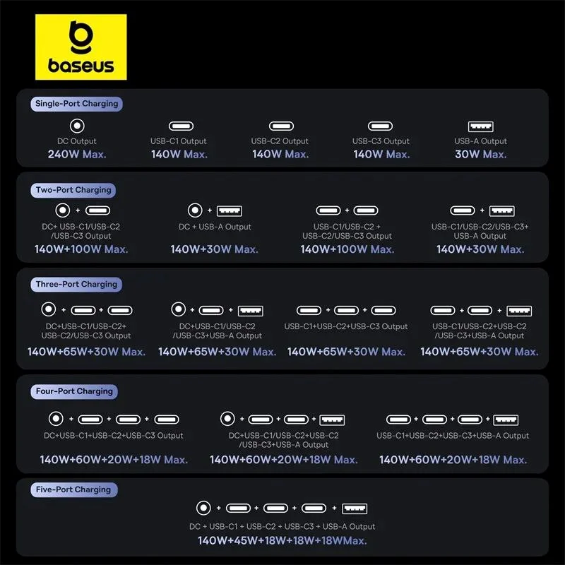 - پنج درگاه در کنار هم: در صورت استفاده از هر درگاه در کنار هم، درگاه DC توان 140 وات، درگاه Type-c شماره 1 توان 45 وات و درگاههای دیگر در مجموع 55 وات توان خواهند داشت.
