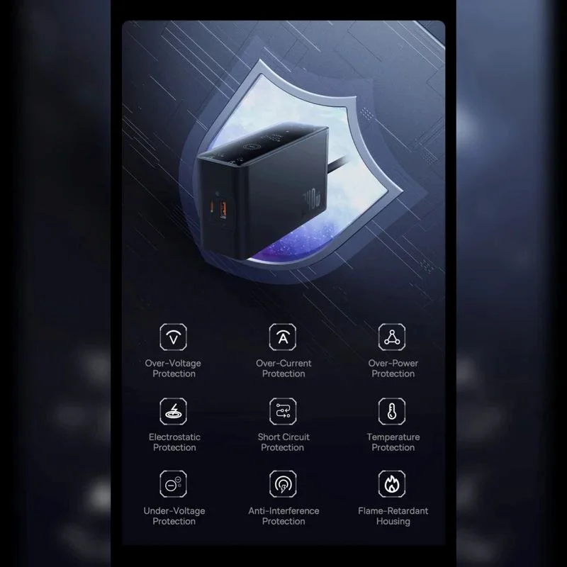 شارژر 5 پورت Baseus CCGAN240CE دارای بدنه نسوز بوده که باعث ایمنی این محصول میشود. علاوه بر این دارای 9 مورد استاندارد ایمنی بوده که شامل این موارد است: