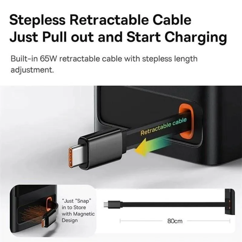 شارژر بیسوس مدل PSLR000301 با 4 خروجی قابلیت اتصال همزمان چند دستگاه را به شما می دهد. پورت تایپ سی این هاب برای شارژ لپ تاپ و موبایل هایی که توان تا 65 وات دارند مناسب است و میتوانید از هاب بیسوس برای شارژ سریع آن ها استفاده کنید. علاوه بر این هاب شارژر بیسوس با داشتن کابل تایپ سی 80 سانتی متری دستگاه های تایپ سی شما را با سرعت بالایی شارژ میکند. به علاوه سری این کابل شارژ به صورت مگنتی هم بوده که می توانید با اتصال به بخش کناری کابل را جمع کنید، این کار مدیریت کابل را راحت و آسانتر میکند.
