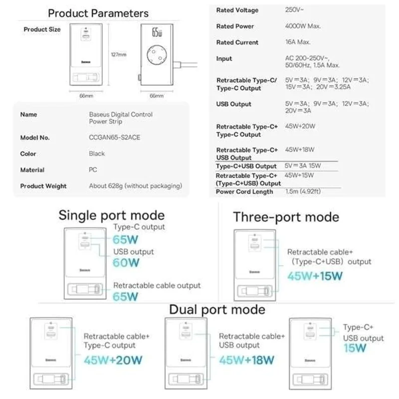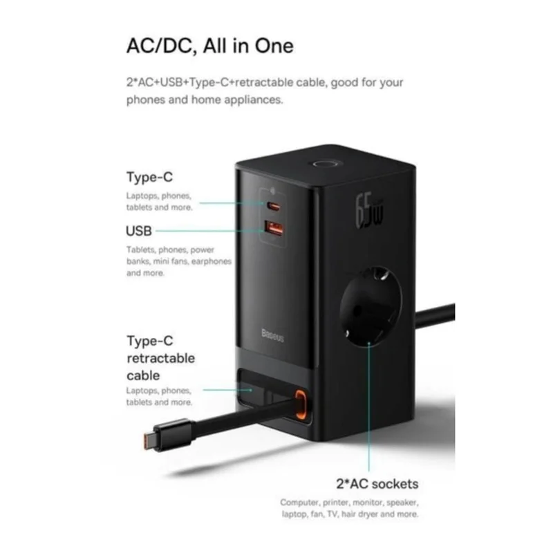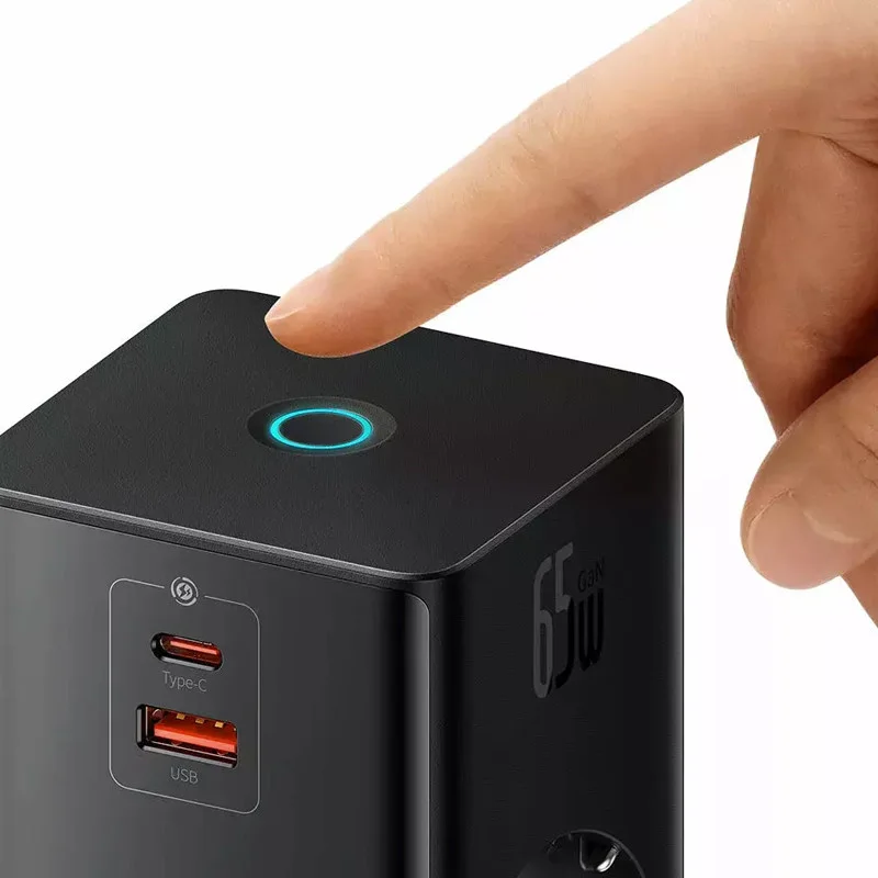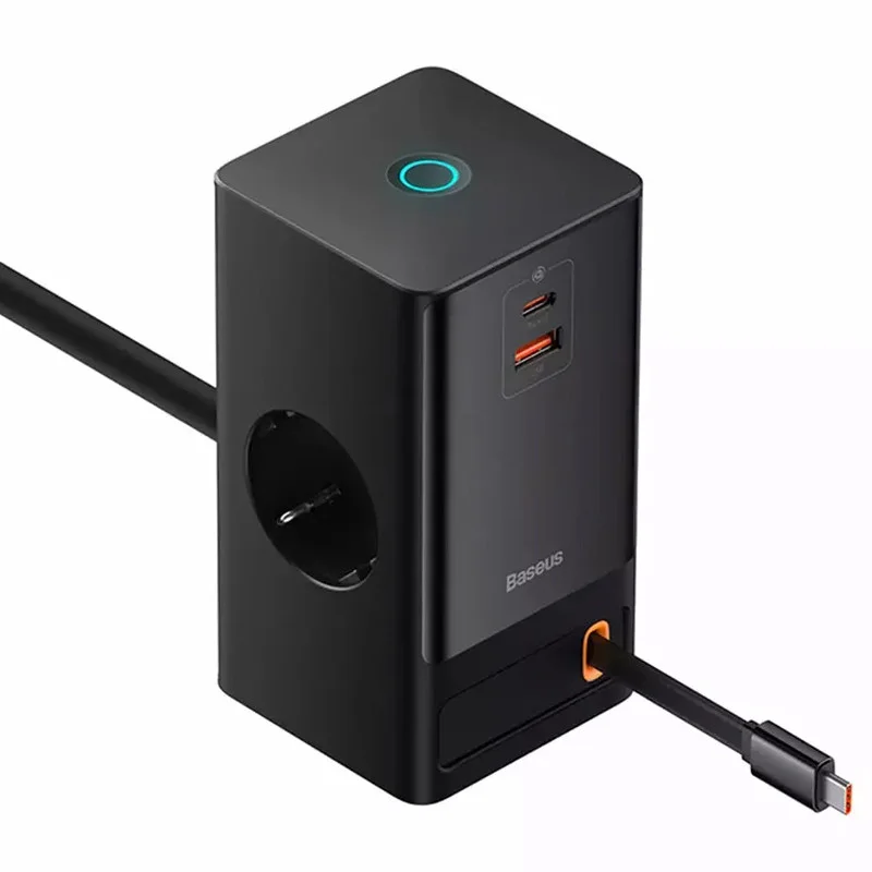 شارژر 4 پورت بیسوس دارای 4 پورت شارژ شامل 1 خروجی USB و 1 خروجی Type C و دو خروجی AC (پریز برق) است. همچنین این محصول دارای یک کابل متصل تایپ سی است و برای دستگاه هایی که از درگاه Type C پشتیبانی میکنند قابل استفاده است. طول این کابل 80 سانتی متر است که باعث میشود به سادگی بتوانید آن را به وسایل مختلف خود وصل کنید. از دکمه لمسی موجود بر روی این محصول میتوانید برای روشن یا خاموش کردن آن استفاده کنید. سیم برق این هاب به طول 1.5 متر، از ضخامت و کیفیت بالایی برخوردار است که در استفاده مداوم هیچ گونه مشکلی نخواهید داشت.