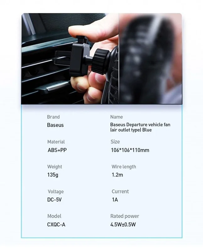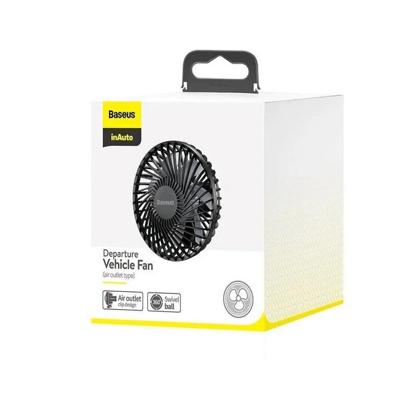 پنکه قابل حمل مخصوص خودرو بیسوس BASEUS Departure Car Vehicle Cooling Fan قابل نصب بر روی دریچه تهویه هوا می باشد. ابعاد این فن بسیار جمع و جور بوده و در داخل خودرو فضای زیادی را اشغال نمی کند.