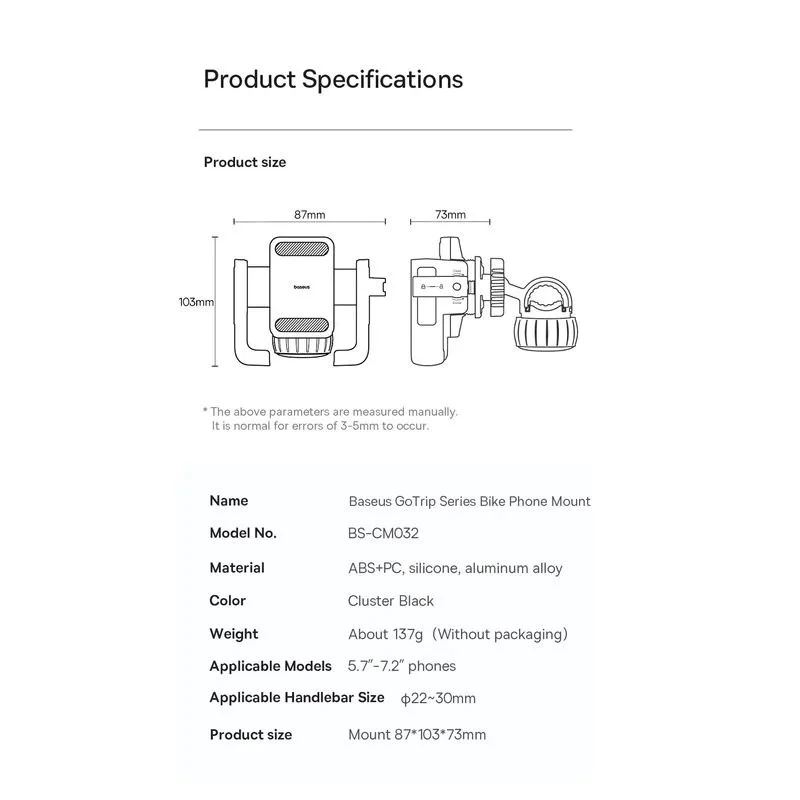 جنس هولدر دوچرخه و موتور بیسوس Baseus GoTrip C40572301111-00 از پلاستیک باکیفیت از نوع ABS و PC همراه با سیلیکون و آلومینیوم است که از هرگونه آسیب و خط و خش جلوگیری می کند. همچنین این هولدر دارای قابلیت ضد شوک و ضد لرزش است. هولدر گوشی بیسوس Baseus GoTrip مناسب برای انواع گوشی موبایل با سایزهای 5.7 تا نهایتاً 7.2 اینچی می باشد عرض دهانه هولدر 22 تا 33 میلیمتر باز می شود بنابراین برای انواع گوشی ها و دوچرخه ها مناسب است و البته از کیفیت ساخت بالایی برخوردار می باشد.