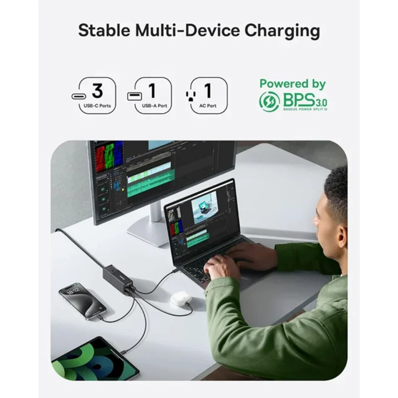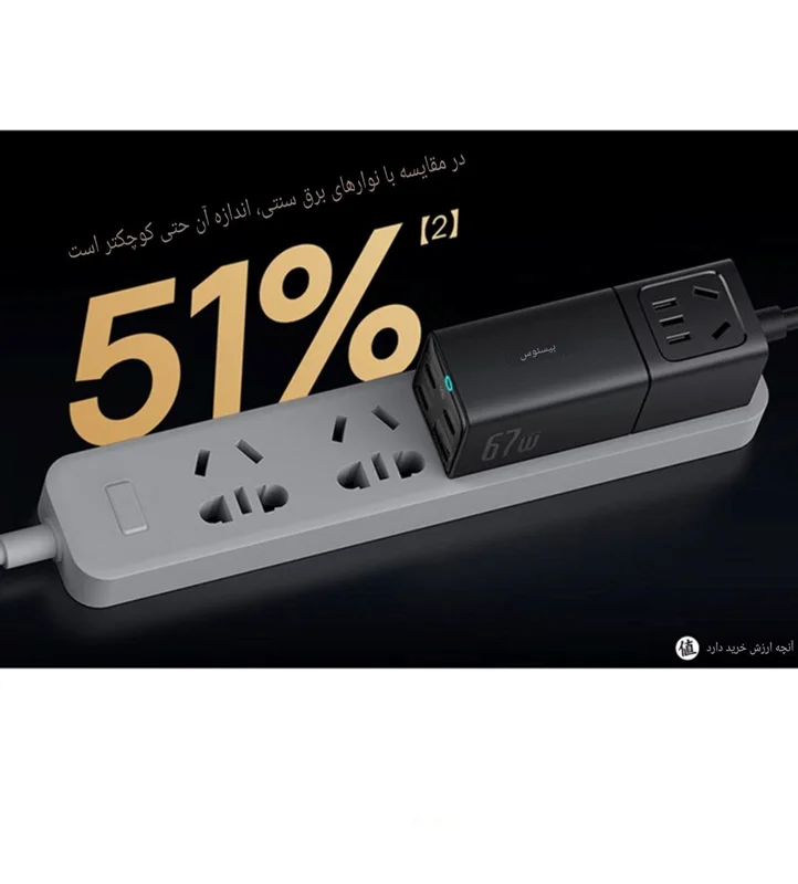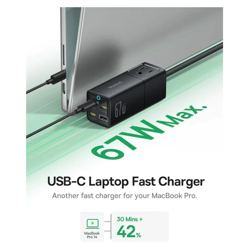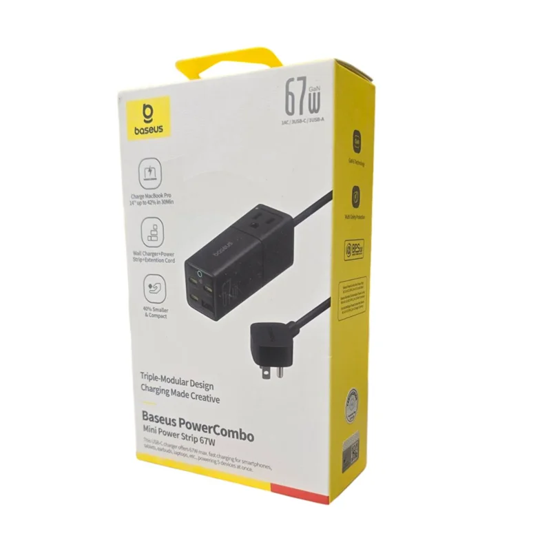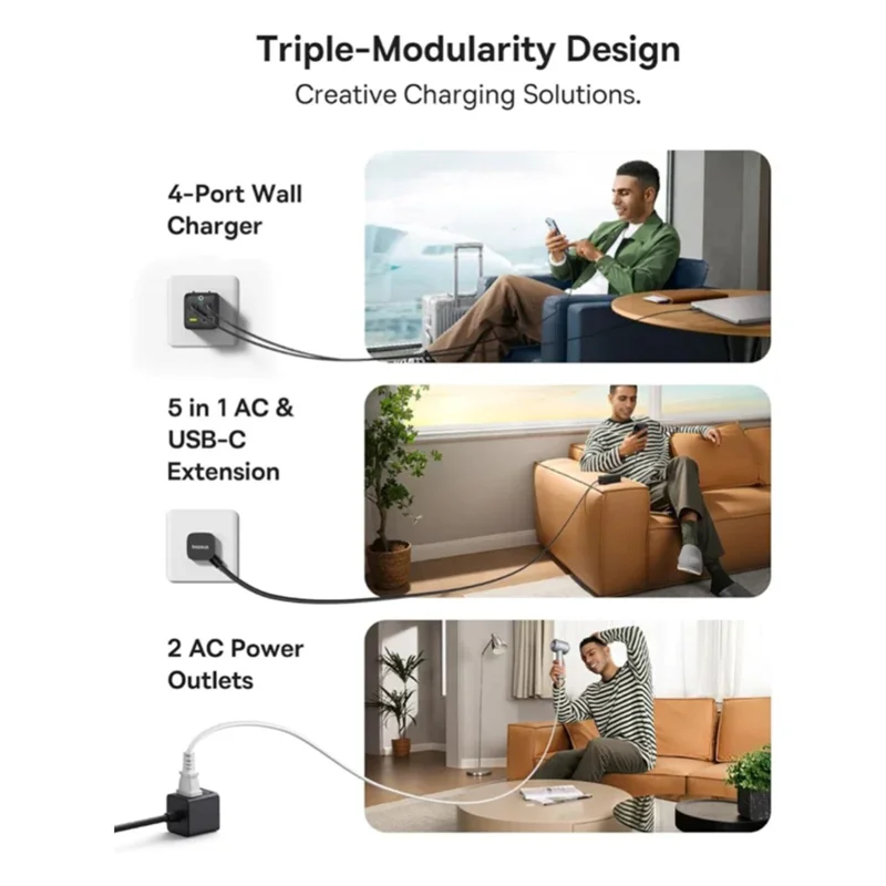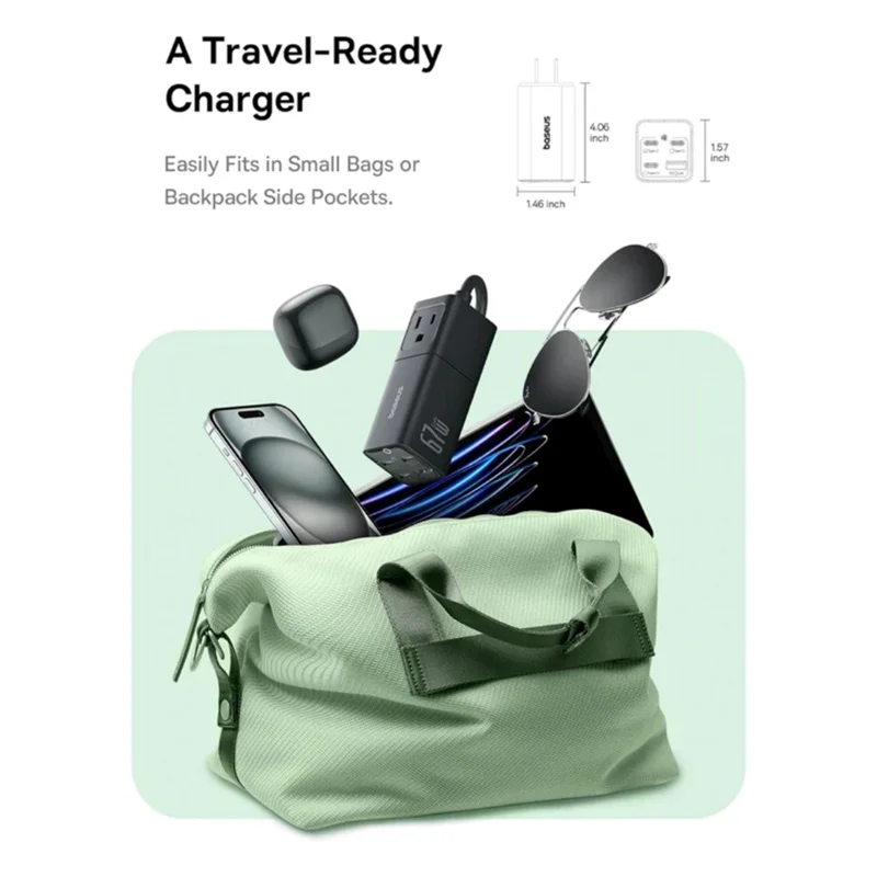 طراحی شگفت انگیز شارژر جدید بیسوس قابل جدا شدن با هدف ارائه یک راه حل برق همه کاره و قابل حمل برای مسافران است، شما می توانید از این ایستگاه شارژ به 3 روش مختلف استفاده کنید: یک شارژر دیواری 4 پورت، یک سیم کشی 5 فوتی با 2 خروجی، یا یک نوار برق سفری 5 در 1. جمع و جور و سبک است که می توانید آن را در هر جایی از کیف خود حمل کنید!شارژر سریع USB C مک بوک پرو 14 اینچی شما را تا 42 درصد و آیفون 15 تا 50 درصد را تنها در 30 دقیقه با توان خروجی چشمگیر 67 وات قدرت می دهد. همچنین از منبع تغذیه قابل برنامه ریزی (PPS) برای سازگاری با Samsung Super Fast Charging 2.0 پشتیبانی می کند.