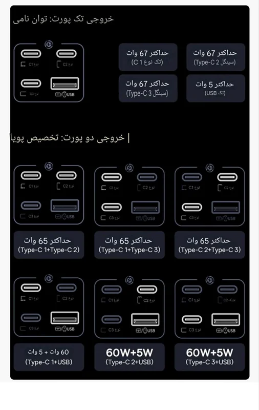 شارژ سریع USB-C: با 3 پورت USB-C 67 واتی در جلو، می توانید تقریباً هر چیزی از جمله تلفن، تبلت یا لپ تاپ خود را با سرعت بالا شارژ کنید. توجه: 3 پورت USB-C در صورت استفاده همزمان در مجموع 60 وات مشترک هستند.