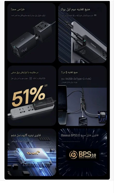 فناوری GaN6 وBPS3 : این شارژر GaN از فناوری GaN6 استفاده می کند که عملکرد قدرتمندتر را با نرخ تبدیل انرژی بالاتر در اندازه بسیار کوچکتر تضمین می کند. و BPS3.0 می تواند به صورت پویا قدرت شارژ را برای شارژ پایدار چند دستگاه اختصاص دهد و تجربه شارژی را برای شما به ارمغان بیاورد که قبلاً هرگز نداشته اید.