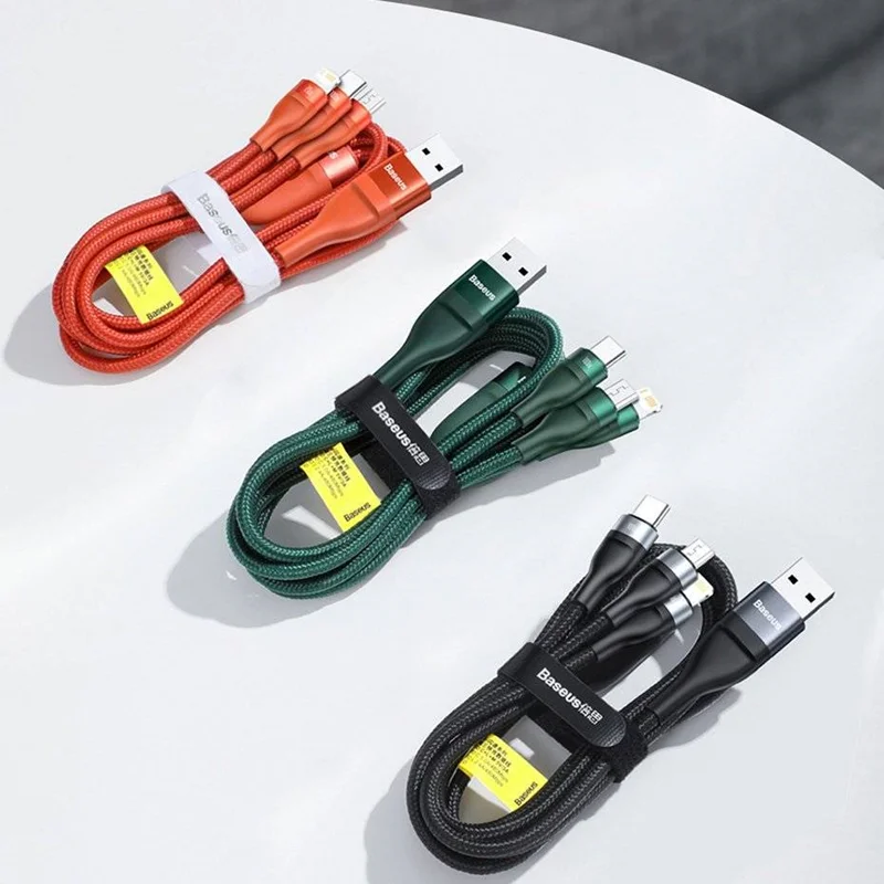 شرکت بیسوس این کابل را در سه رنگ با کدهای مختلف تولید کرده است. رنگ مشکی با کد CA2T3-G1 ، رنگ نارنجی با کد CA2T3-07 و رنگ سبز CA2T3-06 نشان داده می شوند.امروزه گوشی های موبایل دارای یکی از سه پورت شارژ لایتنینگ ، میکرو یو اس بی و تایپ سی هستند که شما برای شارژ هر کدام از این دستگاه ها که دارای پورت مخصوص به خود می باشد، باید کابل مخصوص آن را نیز با خود داشته باشید. کمپانی Baseus با ساخت کابل Flash Series 2 for 3 باعث شده تا شما بتوانید با به همراه داشتن یک کابل امکان شارژ هر سه نوع درگاه برای شما موجود باشد. این کابل دارای کانکتور های Lightning ،Type-C وMicro USB بوده و به شما این امکان را می دهد تا هر نوع گوشی را شارژ کنید.