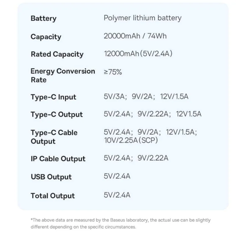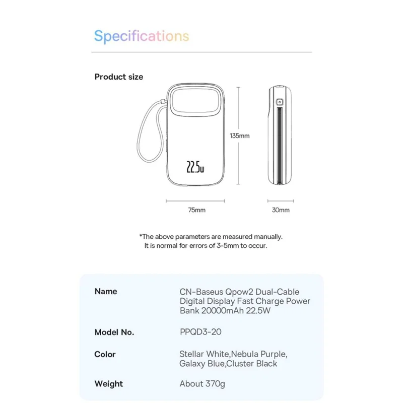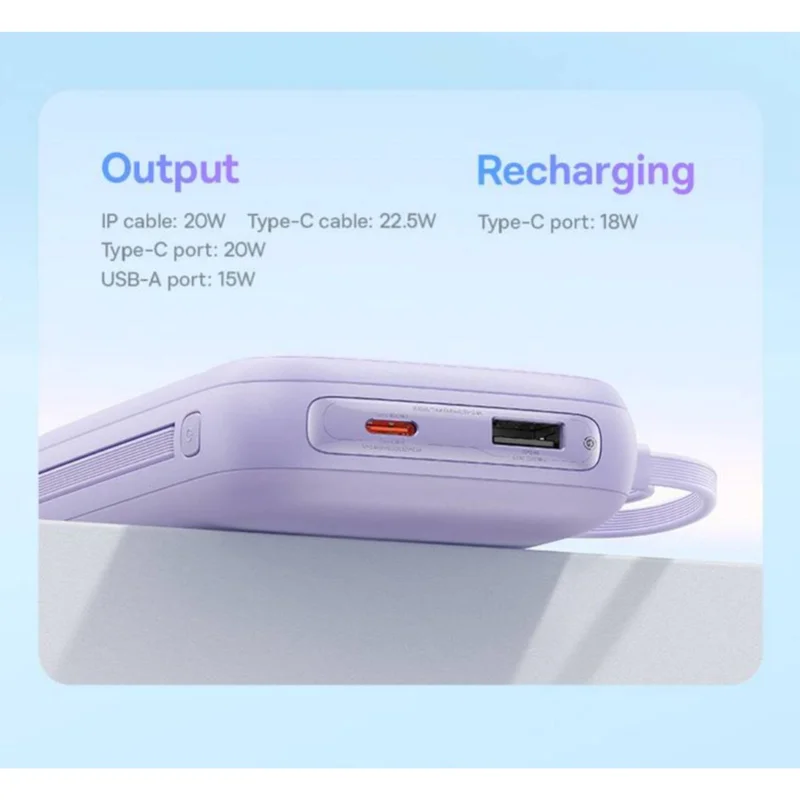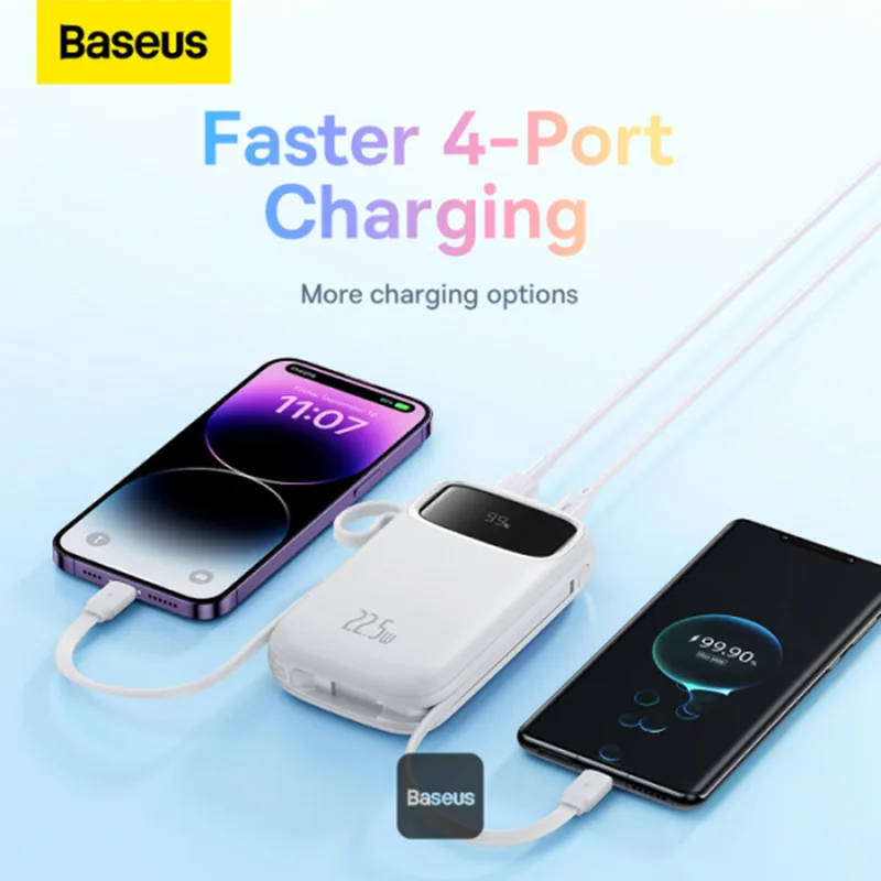 با استفاده از پاوربانک شارژ سریع 20000 میلی آمپر ساعتی 22.5 واتی با صفحه نمایش دیجیتال دو کابلی Baseus Qpow2 در طول روز دستگاه های خود را شارژ کنید. مجهز به دو کابل شارژ است که پاور بانک Qpow2 را بیش از هر زمان دیگری همه کاره می کند.کابل IP خروجی قوی 20 وات را ارائه می دهد در حالی که کابل Type-C خروجی چشمگیر 22.5 وات را ارائه می دهد که از شارژ سریع و موثر دستگاه های مختلف اطمینان می دهد. علاوه بر این، درگاه Type-C خروجی 20 واتی را ارائه می دهد، در حالی که پورت USB-A خروجی 15 واتی خوبی ارائه می دهد که به شما امکان می دهد چندین دستگاه را همزمان بدون کاهش سرعت شارژ کنید.