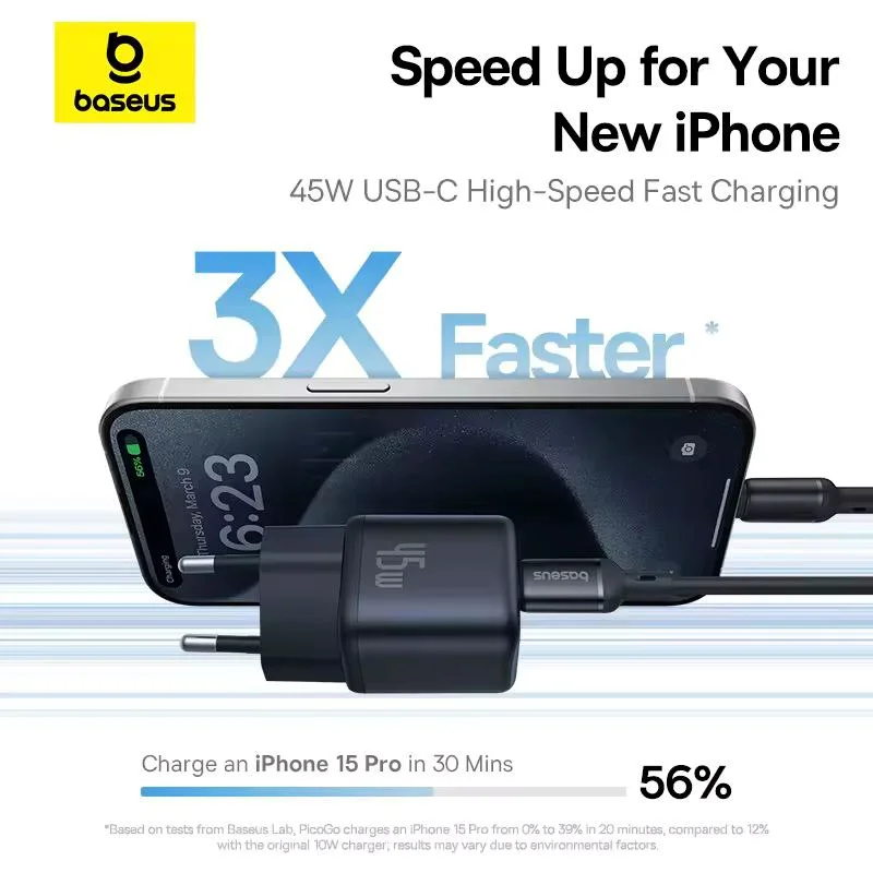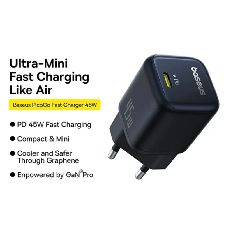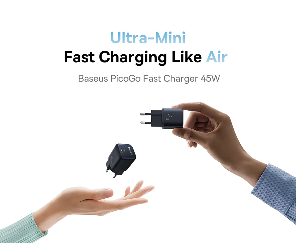 مینی و فشرده: شارژر سریع 45 واتی Baseus PicoGo 54 درصد کوچکتر از شارژر 30 واتی اصلی است. اندازه جمع و جور آن وزن اضافی برای حمل، وصل کردن و جدا کردن آن اضافه نمی کند—ایده آل برای شارژ در حال حرکت در هر مکانی. توجه: دوشاخه قابل باز شدن است.