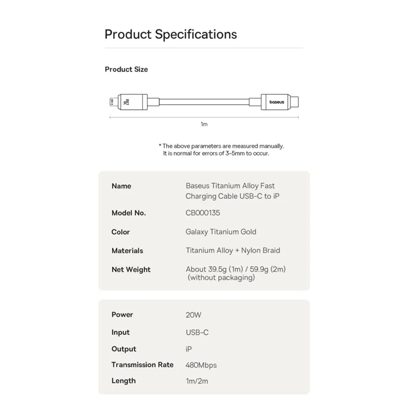 ویژگی های کابل Baseus Titanium Alloy 20W (480Mbps) C تا لایتنینگ Fast Charging