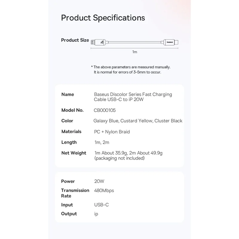 برای کاربران آیفون ، کابل سری Baseus Type-C تا Lightning 20W PD Discolor ترکیبی عالی از شارژ سریع، دوام و سبک است. با این کابل 2 متری ممتاز که برای کاربران مدرن طراحی شده است، به برق وصل بمانید.