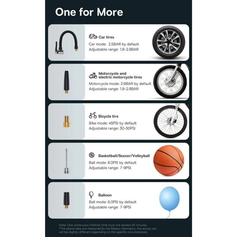 به یک سیلندر فشار قوی 12 ولت مجهز است و عملکردی قدرتمد و پایدار دارد. به راحتی میتوانید لاستیک انواع خودرو، موتور سیکلت، دوچرخه را باد کنید؛ همچنین برای باد کردن توپ و بادکنک هم قابل استفاده است. باد کردن هر کدام از آنها با تعداد سری مخصوص انجام میشود.
