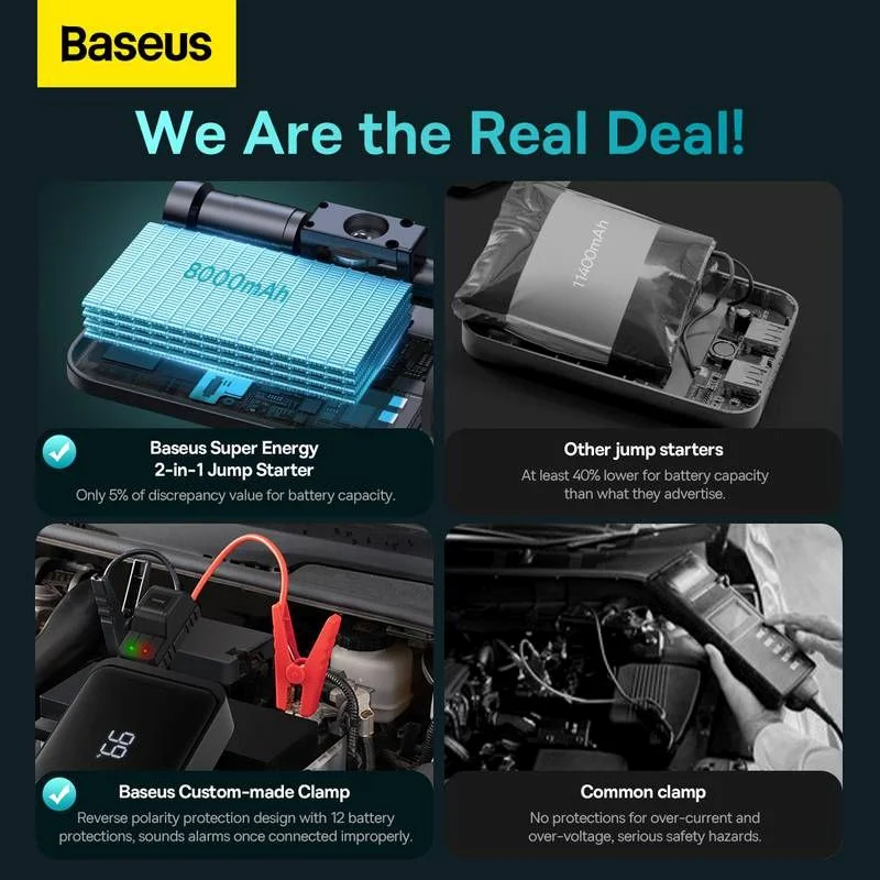 خالی شدن باطری ماشین یا به اصطلاح خوابیدن باتری خودرو خصوصا در مواقعی که بسیار عجله دارید یا در هوای سرد زمستان بسیار غم انگیز و ناراحت کننده است.در این مواقع یا باید به وسیله یک خودروی دیگر عملیات باتری به باتری را انجام داد یا با کمک دیگران ماشین را هل داد که این کارها هم بسیار وقت گیر و خسته کننده و یا در مواقعی غیر قابل انجام می باشد.داشتن یک جامپ استارتر پرقدرت در این شرایط به راحتی مشکل شما را حل کرده و به فریادتان می رسد.پاور بانک و جامپ استارتر قابل حمل خودرو بیسوس Baseus super energy 2-in-1 jump starter 1000A BS-CH003 یکی از محصولات کمپانی بیسوس است که از حداکثر جریان 1000 آمپر برخوردار بوده و علاوه بر جامپاستارتر به عنوان پاوربانک و پمپ باد هم قابل استفاده است.