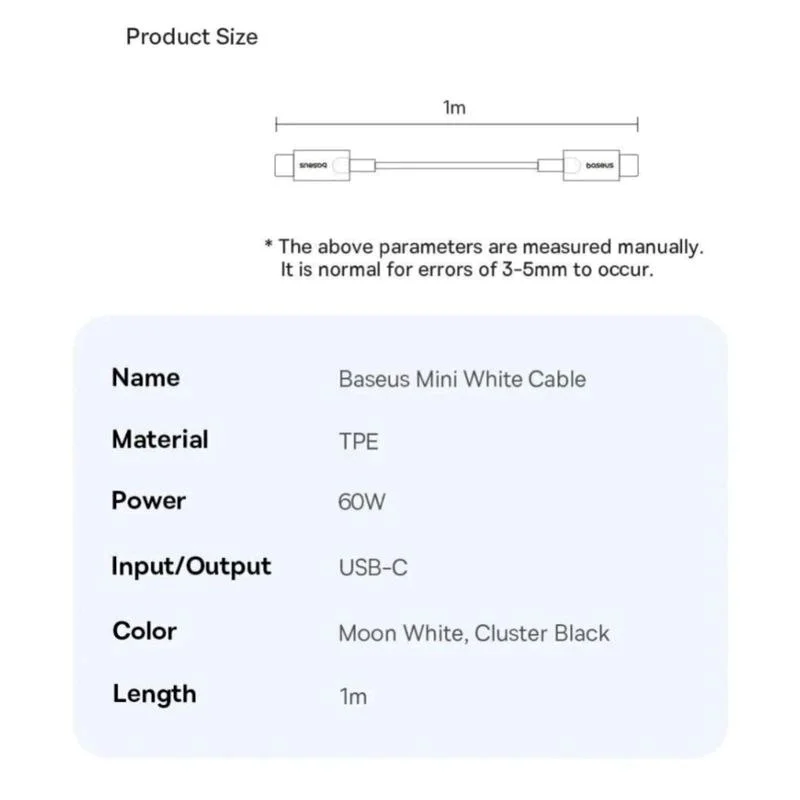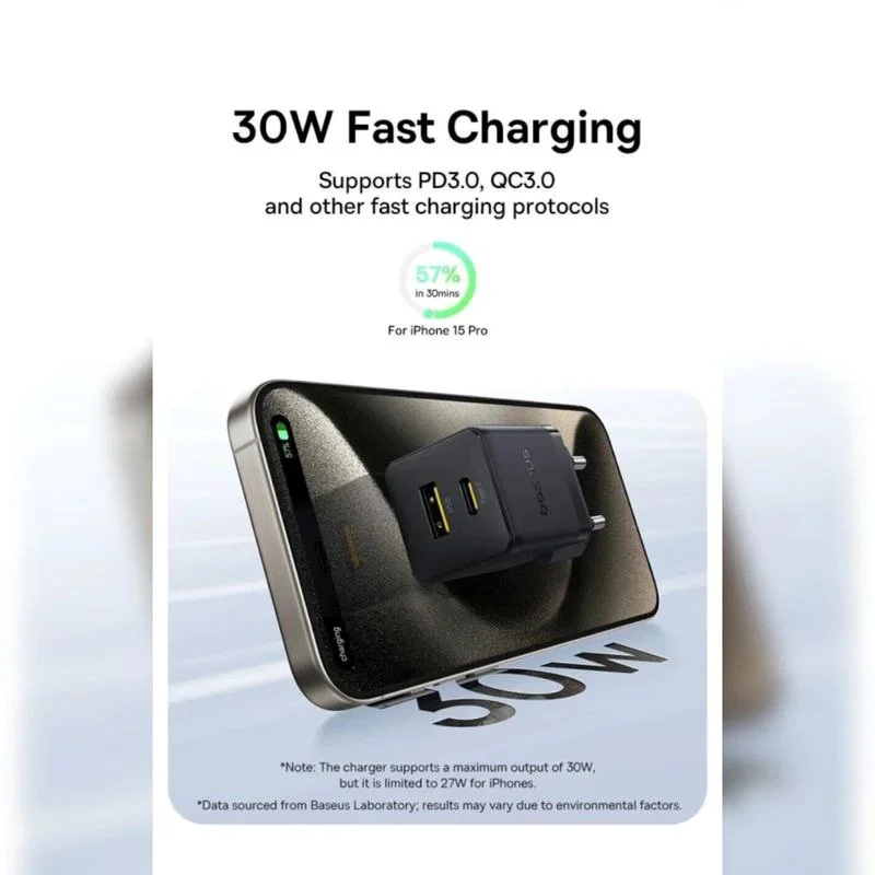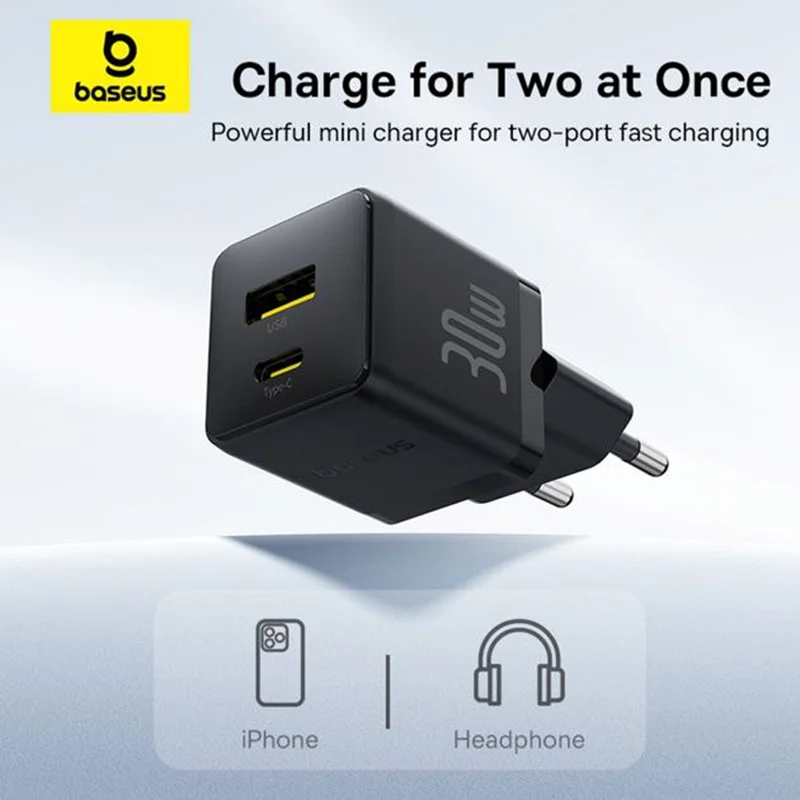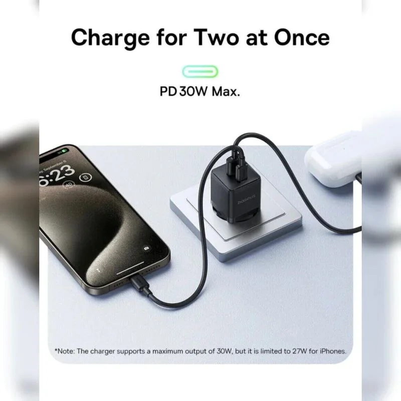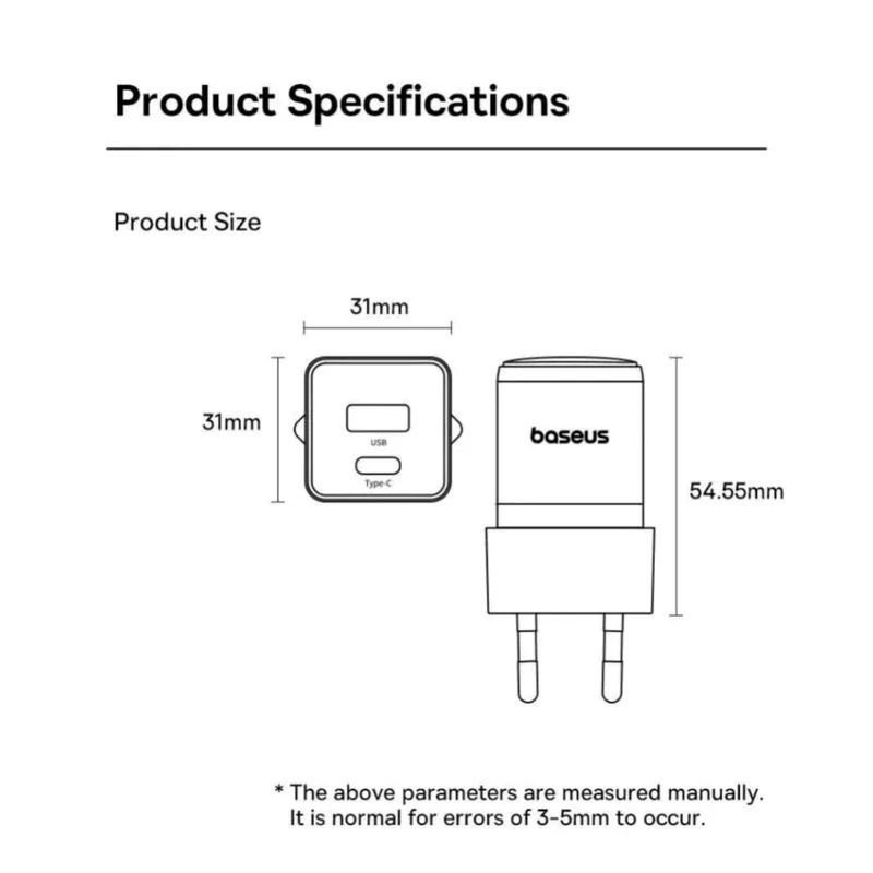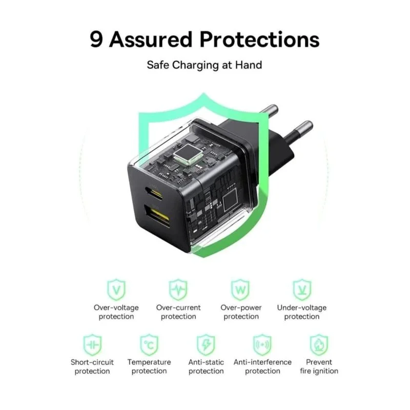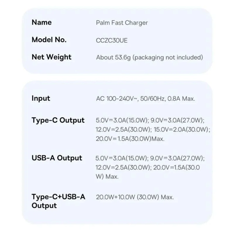 شارژر اصلی Baseus Palm Fast Charger C+U 30W EU یک شارژر جمع و جور و جهانی است که امکان شارژ سریع گجت های مدرن را فراهم می کند. این دستگاه مجهز به درگاههای USB-C و USB-A است، از فناوریهای Power Delivery (PD) و Quick Charge (QC) پشتیبانی میکند و با یک کابل Baseus Mini USB-C به USB-C 60W ارائه میشود. کابل USB-C به USB-C تا 60 وات برق را پشتیبانی می کند و به شما این امکان را می دهد که حتی لپ تاپ ها را شارژ کنید (بسته به سازگاری رنگ مشکی، جلوه ای شیک در برابر گرمای بیش از حد، ولتاژ بیش از حد، اتصال کوتاه و جریان اضافه می کند). این شارژر برای شارژ گوشی های هوشمند، تبلت ها، هدفون های بی سیم، گجت های قابل حمل و حتی برخی از لپ تاپ های دارای PD ایده آل است