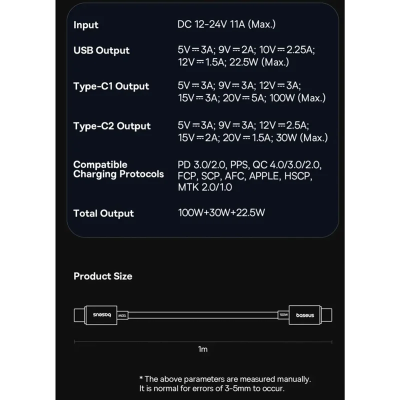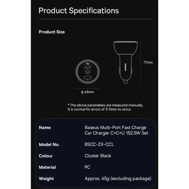 شارژر فندکی 152.5 وات Baseus BSCC-ZX-CCL یک راه حل شارژ قدرتمند و کارآمد است که برای شارژ سریع و همزمان چندین دستگاه در جاده طراحی شده است. با دو پورت USB-C و یک پورت USB-A، از پروتکل های شارژ سریع PD و QC پشتیبانی می کند و از تحویل سریع برق برای گوشی های هوشمند، تبلت ها، لپ تاپ ها و سایر ابزارها اطمینان حاصل می کند.