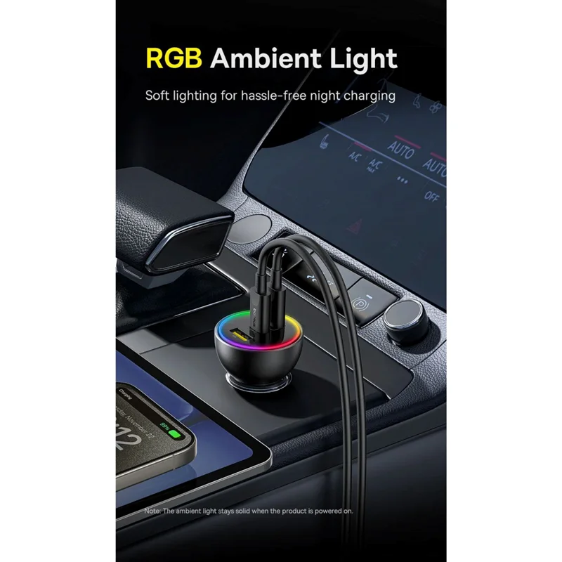 نور محیطی شیک RGB: آداپتور شارژر خودرو می تواند فضای داخلی خودروی شما را با طراحی براق نور RGB روشن کند. چراغ نشانگر نرم و چند رنگ نه تنها تجربه رانندگی شما را در شب افزایش می دهد، بلکه به شما امکان می دهد به سرعت درگاه های شارژ را پیدا کنید و شارژ در شب را بدون دردسر می کند. شامل یک کابل بادوام شارژ سریع 100 واتی برای راحتی.