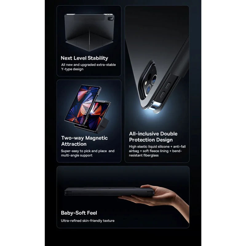ویژگی اصلی این کاور، مغناطیسی بودن آن است که امکان نصب و جدا کردن آیپد از کاور را با یک حرکت ساده و بدون نیاز به دکمهها فراهم میکند. این ویژگی از نقطه نظر کاربری، امکان استفاده آسان از دستگاه را افزایش میدهد و به کاربران اجازه میدهد تا به سرعت و بهراحتی به تنهایی آیپد را از کاور خارج کرده یا آن را به کاور متصل کنند.