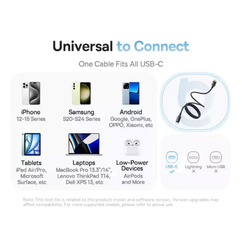 کابل Baseus PicoGo که با طیف گسترده ای از دستگاه ها از جمله iPhone 16، Samsung Galaxy و Google Pixel سازگار است، از انتقال داده 480 مگابیت در ثانیه پشتیبانی می کند و به شما امکان شارژ و همگام سازی همزمان را می دهد. دیگر نگران شارژ نشدن کابل USB نباشید,این کابل با پشتیبانی از دستگاههایی که به کابل شارژ سریع USB-C یا کابل C به نوع C نیاز دارند، برق و داده قابل اعتماد را انتقال میدهد.