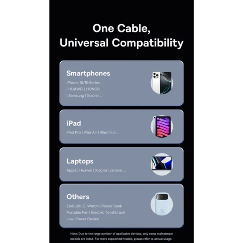 این کابل شارژ سریع که از تحویل برق 60 وات (PD) پشتیبانی میکند، برای آیفون، آیپد، مکبوک، دستگاههای اندروید و سایر گجتهای دارای USB-C/Lightning ایدهآل است. این کابل ضمن حفظ منبع تغذیه پایدار و ایمن، شارژ سریع را تضمین میکند و زمان شارژ را به میزان قابل توجهی کاهش میدهد. چه نیاز به شارژ گوشی هوشمند، تبلت یا لپتاپ داشته باشید، این کابل عملکرد سریع و قابل اعتمادی را ارائه میدهد.