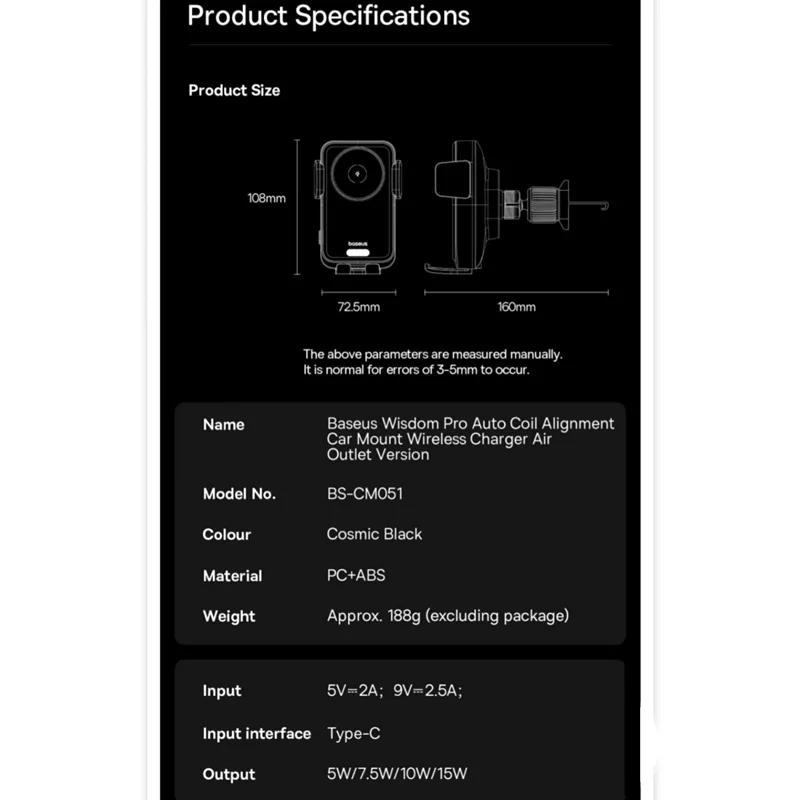 ویژگیهای پایه نگهدارنده گوشی شارژر بیسیم ماشین Baseus Wisdom Pro (تنظیم خودکار کویل، 15 وات)
