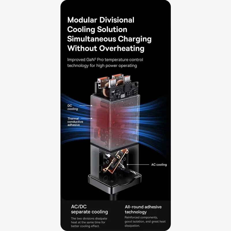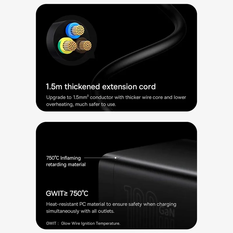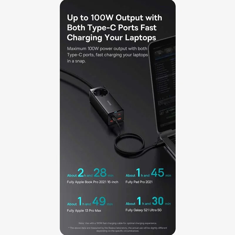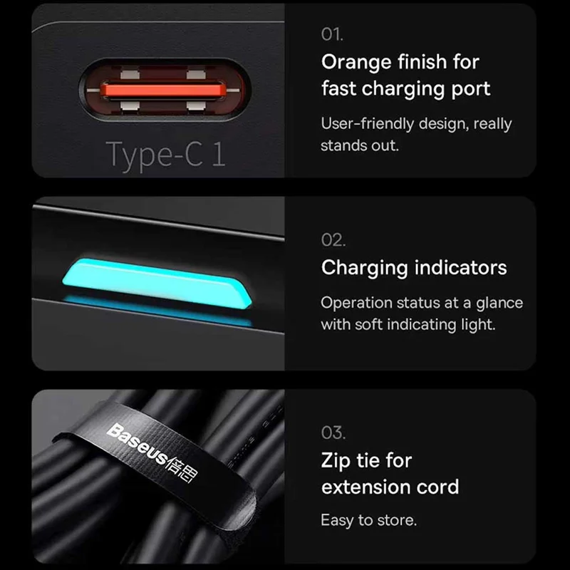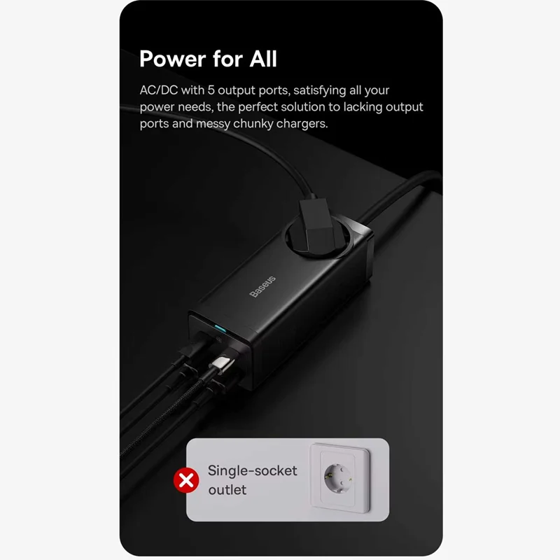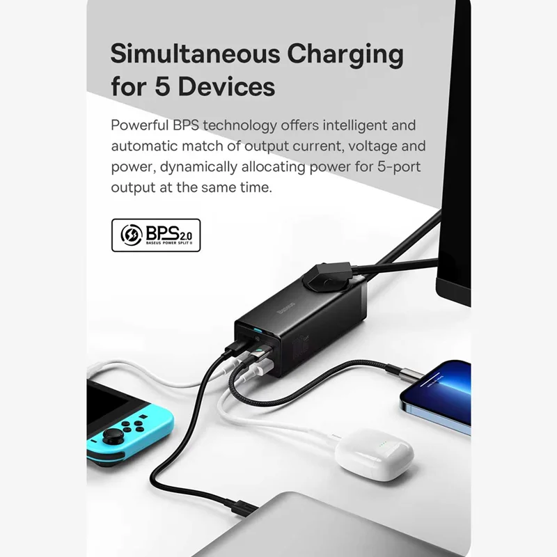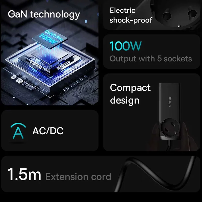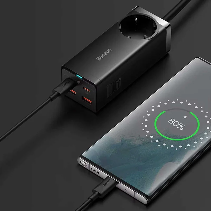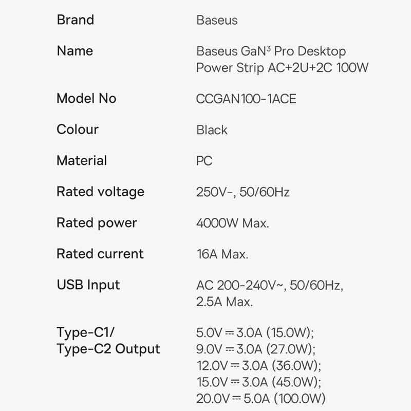 بیسوس برای چند راهی CGAN100-1ACE یک سوکت برق، دو پورت Type-C و دو پورت USB طراحی کرده؛ حداکثر توانی برابر با 100 وات دارد؛ بنابراین به راحتی میتوانید لپ تاپ، گوشی و تبلتهای مختلف با سیستمعاملهای اندروید و iOS را شارژ کنید. درگاه تایپ سی پروتکلهای Apple2.4A, QC2.0, QC3.0, QC4+, AFC, FCP, SCP, PE, PD3.0 and PP و ... را داراست و درگاه یو اس بی هم از پروتکلهای Apple2.4A, QC2.0, QC3.0, AFC, FCP, SCP, PE و ... برخوردار است.