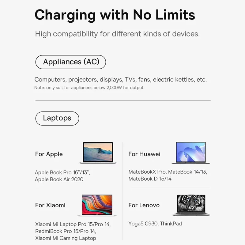 USB1/USB2: 5.0V-3.0A (15.0W); 9.0V-3.0A (27.0W);12.0V-3.0A (36.0W); 20.0V-3.0A (60.0W)