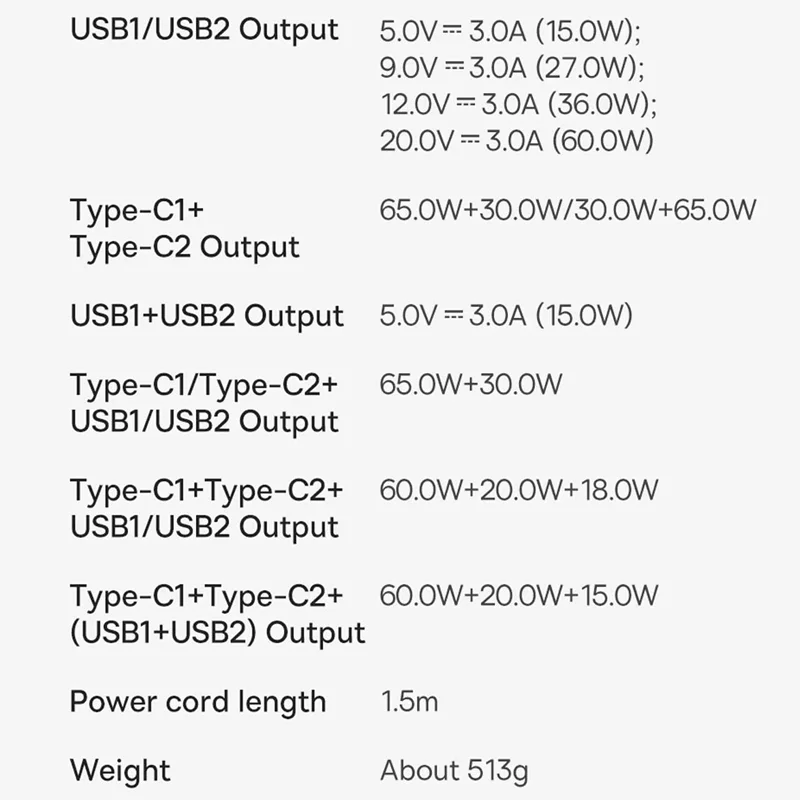 USB1+USB2: 5.0V-3.0A (15.0W) Type-C1/Type-C2+USB1/USB2 Output: 65.0W+30.0W